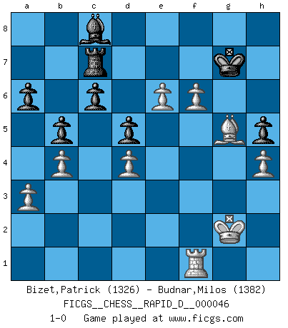 Last move : 1-0 2010 December 4 19:47:32 [Event "FICGS__CHESS__RAPID_D__000046"] [Site "FICGS"] [Date "2010.10.10"] [Round "1"] [White "Bizet,Patrick"] [Black "Budnar,Milos"] [Result "1-0"] [WhiteElo "1326"] [BlackElo "1382"] 1.e4 e5 2.Nf3 Nc6 3.d4 exd4 4.Nxd4 Bc5 5.Be3 Qf6 6.c3 Nge7 7.Bc4 Ne5 8.Be2 Qg6 9.O-O d5 10.f3 O-O 11.Nd2 f5 12.f4 Ng4 13.Bxg4 Qxg4 14.e5 Qxd1 15.Raxd1 Bxd4 16.cxd4 Be6 17.Nb3 b6 18.Rc1 c6 19.Nd2 Rac8 20.b4 b5 21.Nb3 Rfe8 22.Rc5 Ng6 23.Na5 Bd7 24.Nb7 Re6 25.Nd6 Rc7 26.a3 a6 27.Nxf5 Ne7 28.Nd6 g6 29.g4 Kg7 30.Ra1 Nc8 31.Nxc8 Bxc8 32.f5 gxf5 33.gxf5 Re8 34.e6 Kf6 35.Rf1 Rg8+ 36.Kh1 Bb7 37.Rc2 Rg4 38.Rg2 Rxg2 39.Kxg2 Bc8 40.h4 h5 41.Bg5+ Kg7 42.f6+ 1-0 Scotch game Kingside Castling by player White (move 9) Kingside Castling by player Black (move 10) Player White won this chess game. Follow this game move after move (download)Discovered check is the dive bomber of the Chessboard. (Reuben Fine) Nie in meinem Leben habe ich die französische Verteidigung gespielt, welche die Stumpfsinnigste von allen ist. (Wilhelm Steinitz) Cualquier cambio de material en una posición debe venir por medio de un mate, una captura o promoción de Peón. (Purdy) Lorsque vous vous retrouvez devant une position atroce, ne tendez pas un ultime piège dérisoire avec l'intention d'abandonner si l'adversaire le déjoue ! Faites-vous plutôt un devoir de résister comme si votre vie en dépendait. Jouez le coup qui vous déplairait au centuple si vous étiez dans la peau de votre tortionnaire ! There are two kinds of people in the world, my friend. Those who have a loaded gun and those who dig. You dig ! (Blondie in The Good, The Bad and The Ugly)