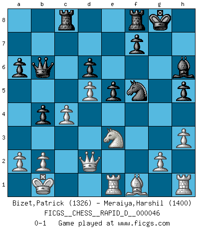 Last move : 0-1 2010 November 21 14:43:20 [Event "FICGS__CHESS__RAPID_D__000046"] [Site "FICGS"] [Date "2010.10.10"] [Round "1"] [White "Bizet,Patrick"] [Black "Meraiya,Harshil"] [Result "0-1"] [WhiteElo "1326"] [BlackElo "1400"] 1.e4 c5 2.Nf3 Nc6 3.d4 cxd4 4.Nxd4 Nf6 5.Nc3 e5 6.Ndb5 d6 7.Bg5 h6 8.Bxf6 gxf6 9.Qd2 a6 10.Na3 h5 11.Nd5 Be6 12.Nc4 Bh6 13.Nce3 O-O 14.O-O-O Rc8 15.c3 b5 16.Kb1 f5 17.f3 fxe4 18.fxe4 b4 19.h3 Bxd5 20.exd5 Ne7 21.c4 Nf5 22.Re1 Qb6 0-1 Sicilian : Pelikan (Lasker/Sveshnikov) variation Kingside Castling by player Black (move 13) Queenside Castling by player White (move 14) Player Black won this chess game. Follow this game move after move (download)The Pin is mightier than the sword. (Fred Reinfeld) Schach ist das Spiel, das die Verrückten gesund hält. (Albert Einstein) Juega la Apertura como un libro, el Juego Medio como un mago y los Finales como una máquina. (Spielmann) Toute estimation doit être constamment réévaluée. (Jacob Estrin) If only people were all showed a certain minimum level of niceness; if only people didn't retract verbal draw offers (without draw box ticked) on ficgs; if only people didn't kill; if only people didn't run concentration / extermination camps, if only people didn't drop nuclear bombs on Hiroshima and Nagasaki, and so on - it would be a much more beautiful world. But sadly, things are not so... (Normajean Yates)