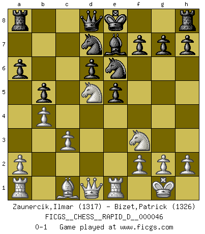 Last move : 0-1 2010 December 7 10:23:34 [Event "FICGS__CHESS__RAPID_D__000046"] [Site "FICGS"] [Date "2010.10.10"] [Round "1"] [White "Zaunercik,Ilmar"] [Black "Bizet,Patrick"] [Result "0-1"] [WhiteElo "1317"] [BlackElo "1326"] 1.e4 e5 2.Nf3 Nc6 3.Bb5 a6 4.Ba4 Nf6 5.O-O Be7 6.Re1 d6 7.c3 b5 8.Bb3 Na5 9.Bc2 Bb7 10.d4 Nc6 11.d5 Nb8 12.Nbd2 Nbd7 13.Nf1 c6 14.dxc6 Bxc6 15.Ne3 Bxe4 16.Bxe4 Nxe4 17.Nd5 Nec5 18.b4 Ne6 0-1 This chess game has been lost on time (started : 2010.10.10 2:16:58) Ruy Lopez : Closed, Averbach variation Kingside Castling by player White (move 5) Player Black won this chess game. Follow this game move after move (download)Daring ideas are like Chess men moved forward. They may be beaten, but they may start a winning game. (Johann Wolfgang von Goethe) Taktik ist was man tun muß, wenn etwas zu tun ist. Strategie ist was man tun muß, wenn nichts zu tun ist. (Savielly Grigorievitsch Tartakower) ¿Cual es el objetivo de jugar una apertura de gambito?... Para adquirir una reputación de ser un jugador apuesto a costo de perder el juego. (Siegbert Tarrasch) Ce n'est pas pour s'amuser qu'il joue aux échecs : il célèbre un culte. (Vladimir Nabokov) If you ain't just a little scared when you enter a casino, you are either very rich or you haven't studied the games enough. (Pappy)