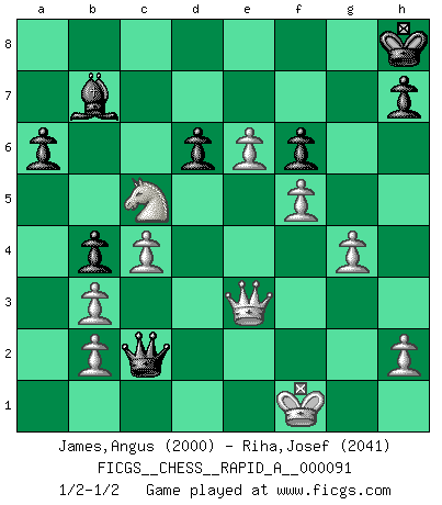 Last move : 1/2-1/2 2010 November 5 9:35:41 [Event "FICGS__CHESS__RAPID_A__000091"] [Site "FICGS"] [Date "2010.10.10"] [Round "1"] [White "James,Angus"] [Black "Riha,Josef"] [Result "1/2-1/2"] [WhiteElo "2000"] [BlackElo "2041"] 1.e4 e5 2.Nf3 Nc6 3.Bb5 a6 4.Ba4 d6 5.O-O b5 6.Bb3 Nf6 7.Re1 Na5 8.d4 Nxb3 9.axb3 Nd7 10.dxe5 Nxe5 11.Bf4 f6 12.Nc3 c6 13.Nd4 b4 14.Na4 Qc7 15.Be3 g6 16.f4 Ng4 17.Bd2 c5 18.Nf5 gxf5 19.exf5 Kf7 20.Qxg4 Rg8 21.Qh5+ Kg7 22.c4 Bb7 23.g4 Qc6 24.Qh3 Kh8 25.Kf2 Bg7 26.Re6 Rae8 27.Rae1 Rxe6 28.Rxe6 Re8 29.Ke2 Bf8 30.Be3 Rxe6 31.fxe6 Qh1 32.Qg3 Qe4 33.f5 Bh6 34.Nxc5 Qc2 35.Kf1 Bxe3 36.Qxe3 1/2-1/2 Ruy Lopez : Modern Steinitz defense, 5.O-O Kingside Castling by player White (move 5) This chess game ended in a draw. Follow this game move after move (download)A Chess game is a dialogue, a conversation between a player and his opponent. Each move by the opponent may contain threats or be a blunder, but a player cannot defend against threats or take advantage of blunders if he does not first ask himself: What is my opponent planning after each move ? (Bruce A. Moon) Er war ein guter Schachspieler, aber ich kann Leute nicht ausstehen, die 'Heil Hitler' rufen (Über Alexander Aljechin). (Miguel Najdorf) Cuando veas una buena jugada, trata de encontrar otra mejor. (Emanuel Lasker) Vous savez, camarade Pachman, je n'éprouve pas de plaisir à être ministre, je jouerais plutôt aux échecs comme vous, ou alors ferais une révolution au Venezuela. (Che Guevara à Ludek Pachman, 'Checkmate in Prague', 1975) To send light into the darkness of men's hearts - such is the duty of the artist. (Schumann)