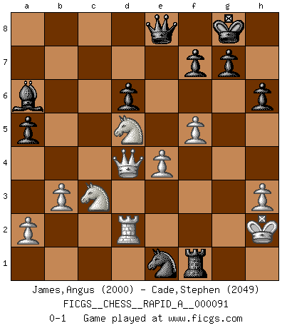 Last move : 0-1 2010 December 3 12:50:36 [Event "FICGS__CHESS__RAPID_A__000091"] [Site "FICGS"] [Date "2010.10.10"] [Round "1"] [White "James,Angus"] [Black "Cade,Stephen"] [Result "0-1"] [WhiteElo "2000"] [BlackElo "2049"] 1.e4 c5 2.Nf3 d6 3.d4 cxd4 4.Nxd4 Nf6 5.Nc3 a6 6.Bc4 e6 7.O-O b5 8.Bb3 Be7 9.Qf3 Qb6 10.Be3 Qb7 11.Qg3 b4 12.Na4 Nbd7 13.f3 O-O 14.Rfd1 Ne5 15.Ne2 a5 16.c4 bxc3 17.Nexc3 Ra6 18.Rac1 Rc6 19.Qf2 Qb8 20.Bd4 Bd8 21.Qe3 Ba6 22.Kh1 h6 23.Rc2 Nfd7 24.f4 Nc4 25.Qf3 Be7 26.Rf2 Rfc8 27.Bxc4 Bxc4 28.b3 Ba6 29.f5 e5 30.Nd5 Bh4 31.g3 exd4 32.gxh4 Rc1 33.Rfd2 Ne5 34.Qf2 R8c2 35.Rxc1 Rxc1+ 36.Kg2 Qb5 37.h3 Rf1 38.Qxd4 Nf3 39.Nac3 Nxh4+ 40.Kh2 Nf3+ 41.Kg2 Ne1+ 42.Kh2 Qe8 0-1 Sicilian : Najdorf, Lipnitzky attack Kingside Castling by player White (move 7) Kingside Castling by player Black (move 13) Player Black won this chess game. Follow this game move after move (download)The battle for the ultimate truth will never be won. And that's why Chess is so fascinating. (Hans Kmoch) Es ist peinlich, dass ich nie Weltmeister wurde. Es wäre leicht, Leonid Breschnjew als Ursache vorzuschieben, dessen Apparat den Vorzeigekommunisten Anatoli Karpow in allem unterstützte. Aber Garri Kasparow zum Beispiel, der ebenfalls von den Sowjets unerwünscht war, hat trotz der Widerstände den WM-Titel erobert. (Viktor Kortschnoi) Yo no le temo a Spassky. Todos saben que yo soy el mejor. Uno no necesita un torneo para probarlo. (Bobby Fischer) La victoire dans une partie d'Echecs appartient la plupart du temps à celui qui voit un peu plus loin que l'adversaire. (Lasker) The only thing that overcomes hard luck is hard work. (Harry Golden)