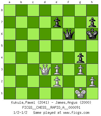 Last move : 1/2-1/2 2010 December 6 13:45:37 [Event "FICGS__CHESS__RAPID_A__000091"] [Site "FICGS"] [Date "2010.10.10"] [Round "1"] [White "Kukula,Pawel"] [Black "James,Angus"] [Result "1/2-1/2"] [WhiteElo "2041"] [BlackElo "2000"] 1.d4 Nf6 2.c4 g6 3.g3 Bg7 4.Bg2 O-O 5.Nc3 d6 6.Nf3 Nc6 7.O-O a6 8.Qd3 Bd7 9.d5 Nb4 10.Qd1 a5 11.a3 Na6 12.Be3 c6 13.Bd4 Nc5 14.Rb1 cxd5 15.Nxd5 Nxd5 16.Bxg7 Ne3 17.fxe3 Kxg7 18.Qd4+ f6 19.b4 Ne6 20.Qe4 axb4 21.axb4 Rc8 22.Rfc1 Qc7 23.Ra1 b5 24.c5 dxc5 25.Ra6 f5 26.Qb1 Kh6 27.Qa1 Bc6 28.Ng5 Nxg5 29.Rxc6 Qd7 30.Rd1 Qe8 31.Rxc5 Ne4 32.Bxe4 fxe4 33.Rf1 Rxc5 34.Rxf8 Qxf8 35.bxc5 b4 36.c6 b3 37.c7 Qc8 38.Qe5 b2 39.Qxe4 Qxc7 40.Qh4+ Kg7 41.Qd4+ Kh6 42.Qxb2 Qc4 43.Qd2 g5 44.Qd3 Qe6 45.Kg2 g4 46.Kf2 Qf6+ 47.Kg1 1/2-1/2 King's Indian : 3.g3 Kingside Castling by player Black (move 4) Kingside Castling by player White (move 7) This chess game ended in a draw. Follow this game move after move (download)My opponents make good moves too. Sometimes I don't take these things into consideration. (Bobby Fischer) Es ist im Leben wie im Schachspiel. Wir entwerfen einen Plan, dieser bleibt jedoch bedingt durch das, was im Schachspiel dem Gegner, im Leben dem Schicksal zu tun belieben wird. (Arthur Schopenhauer) No volvere nunca a jugar contigo. Has insultado a mi amigo. - cuando un oponente se maldijo por una mala jugada (Miguel Najdorf) Avec des compensations pour le matériel en plus... (Anonyme) All battles are fought by scared men who'd rather be someplace else. (John Wayne in the movie In harm's way)