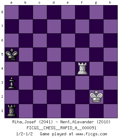 Last move : 1/2-1/2 2010 October 19 22:55:8 [Event "FICGS__CHESS__RAPID_A__000091"] [Site "FICGS"] [Date "2010.10.10"] [Round "1"] [White "Riha,Josef"] [Black "Nent,Alexander"] [Result "1/2-1/2"] [WhiteElo "2041"] [BlackElo "2010"] 1.e4 c5 2.Nf3 g6 3.d4 cxd4 4.Nxd4 Nc6 5.c4 Nf6 6.Nc3 d6 7.Be2 Nxd4 8.Qxd4 Bg7 9.O-O O-O 10.Qe3 Be6 11.Rb1 Qb6 12.Qd3 Rac8 13.b3 Rfe8 14.Be3 Qa5 15.Bd4 Nd7 16.Bxg7 Kxg7 17.Rbd1 a6 18.f4 f6 19.Qe3 Qc5 20.Qxc5 Rxc5 21.Rf3 Bg4 22.Re3 Bxe2 23.Rxe2 b5 24.Rc1 g5 25.fxg5 fxg5 26.Re3 Rec8 27.Nd5 e6 28.Nb4 a5 29.Nd3 R5c6 30.Nb2 Ne5 31.Rd1 bxc4 32.Nxc4 Nxc4 33.bxc4 Rxc4 34.Rxd6 Kf6 35.Rd7 Rc1+ 36.Kf2 R8c2+ 37.Re2 Rxe2+ 38.Kxe2 h5 39.Rd3 Rc4 40.Kf3 g4+ 41.Kf4 Rc2 42.e5+ Kg6 43.Rd6 Rxg2 44.Rxe6+ Kf7 45.Ra6 Rf2+ 46.Kg3 Rf3+ 47.Kg2 Ra3 48.Rh6 Rxa2+ 49.Kg3 Ra3+ 50.Kf4 Rf3+ 51.Ke4 Rh3 52.e6+ Ke7 53.Ke5 Rxh2 54.Rh7+ Kf8 55.e7+ Ke8 56.Ke6 Re2+ 57.Kf6 Kd7 58.Rxh5 Re6+ 59.Kf5 g3 60.Rg5 Re3 61.Kf4 Ra3 62.Re5 Ke8 63.Re2 a4 64.Kg4 Rb3 65.Kh3 a3 66.Re6 Rb1 67.Ra6 Ra1 68.Kxg3 Kxe7 69.Kf2 Kd7 70.Kg2 Kc7 71.Rh6 Kb7 72.Rh3 Kb6 73.Rb3+ Kc5 74.Re3 Kc4 75.Rf3 Kb4 76.Rf4+ Ka5 1/2-1/2 Sicilian : Hungarian variation Kingside Castling by player White (move 9) Kingside Castling by player Black (move 9) 10 pieces endgame at move 44 : White KRPPP , Black KRPPP WHITE : King + 1 Rook 3 Pawns BLACK : King + 1 Rook 3 Pawns 9 pieces endgame at move 48 : White KRPP , Black KRPPP WHITE : King + 1 Rook 2 Pawns BLACK : King + 1 Rook 3 Pawns 8 pieces endgame at move 53 : White KRP , Black KRPPP WHITE : King + 1 Rook 1 Pawn BLACK : King + 1 Rook 3 Pawns 7 pieces endgame at move 58 : White KRP , Black KRPP WHITE : King + 1 Rook 1 Pawn BLACK : King + 1 Rook 2 Pawns 6 pieces endgame at move 68 : White KRP , Black KRP WHITE : King + 1 Rook 1 Pawn BLACK : King + 1 Rook 1 Pawn 5 pieces endgame at move 68 : White KR , Black KRP WHITE : King + 1 Rook BLACK : King + 1 Rook 1 Pawn This chess game ended in a draw. Follow this game move after move (download)A thorough understanding of the typical mating continuations makes the most complicated sacrificial combinations leading up to them not only not difficult, but almost a matter of course. (Siegbert Tarrasch) Gewinnen beim Schach fördert das Selbstvertrauen. Beim Sex spüre ich sowas nicht... (Garry Kasparov) a manera como él juega al Ajedrez, demuestra la completa naturaleza de un hombre. (Stanley Ellin) La conception d'un plan est le processus par lequel un joueur exploite les avantages de sa position tout en s'efforçant d'en réduire au minimum les inconvénients. Afin de garantir le succès, un plan doit toujours se fonder sur un diagnostic objectif des particularités d'une position. La conception d'un plan est d'autant plus difficile que la position est équilibrée, et grandement facilitée lorsqu'il n'existe qu'un seul plan susceptible de répondre aux exigences de la position. (Harry Golombek) Computers make it easier to do a lot of things, but most of the things they make it easier to do don't need to be done. (Andy Rooney)