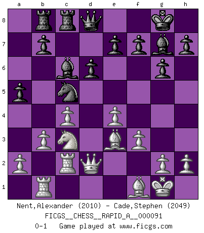 Last move : 0-1 2010 December 3 22:26:47 [Event "FICGS__CHESS__RAPID_A__000091"] [Site "FICGS"] [Date "2010.10.10"] [Round "1"] [White "Nent,Alexander"] [Black "Cade,Stephen"] [Result "0-1"] [WhiteElo "2010"] [BlackElo "2049"] 1.Nf3 c5 2.c4 g6 3.e4 Bg7 4.d4 cxd4 5.Nxd4 Nc6 6.Be3 Nf6 7.Nc3 O-O 8.Be2 d6 9.O-O Bd7 10.Qd2 Nxd4 11.Bxd4 Bc6 12.f3 a5 13.b3 Nd7 14.Be3 Nc5 15.Rab1 Qb6 16.Rfc1 Rfc8 17.Rc2 Qd8 18.Bf1 Rab8 0-1 This chess game has been lost on time (started : 2010.10.10 16:32:26) Reti Opening Kingside Castling by player Black (move 7) Kingside Castling by player White (move 9) Player Black won this chess game. Follow this game move after move (download)Good offense and good defense both begin with good development. (Bruce A. Moon) Ich könnte leicht behaupten: Ja,ja, Leonid Breschnew wollte nicht, daß ich Weltmeister werde. In der Tat war die Sache komplizierter. (Viktor Kortschnoi) El Ajedrez no es como la vida... ¡tiene reglas!. (Mark Pasternak) Assurément je connaissais par expérience le mystérieux attrait de ce jeu royal, le seul entre tous les jeux inventés par les hommes qui échappe souverainement à la tyrannie du hasard, le seul où l'on ne doive sa victoire qu'à son intelligence ou plutôt à une certaine forme d'intelligence. Mais n'est-ce pas déjà le limiter injurieusement que d'appeler les échecs un jeu ? N'est-ce pas une science, un art ou quelque chose qui, comme le cercueil de Mahomet entre ciel et terre, est suspendu entre l'un et l'autre, et qui réunit un nombre incroyable de contraires ? [...] C'est une pensée qui ne mène à rien, une mathématique qui n'établit rien, un art qui ne laisse pas d'uvre, une architecture sans matière; et il l'a prouvé néanmoins qu'il était plus durable, à sa manière, que les livres ou que tout autre monument, ce jeu unique qui appartient à tous les peuples et à tous les temps, et dont personne ne sait quel dieu en fit don à la terre pour tuer l'ennui, pour aiguiser l'esprit et stimuler l'âme. Où commence-t-il, où finit-il ? (Stefan Zweig) Internet: Absolute communication, absolute isolation. (Paul Carvel)