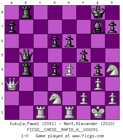 Last move : 1-0 2010 October 19 22:21:55 [Event "FICGS__CHESS__RAPID_A__000091"] [Site "FICGS"] [Date "2010.10.10"] [Round "1"] [White "Kukula,Pawel"] [Black "Nent,Alexander"] [Result "1-0"] [WhiteElo "2041"] [BlackElo "2010"] 1.d4 f5 2.Nf3 Nf6 3.g3 g6 4.Bg2 Bg7 5.O-O d6 6.b3 O-O 7.Bb2 Qe8 8.c4 Na6 9.Qc2 Rb8 10.Nbd2 b5 11.a3 bxc4 12.Qxc4+ Qf7 13.Qc2 e6 14.b4 Bd7 15.Rfe1 Qe7 16.Rac1 Rfc8 17.Qd3 Bb5 18.Qb3 Bd7 19.Bf1 Rb6 20.e3 c5 21.Nc4 R6b8 22.Na5 Nxb4 23.axb4 Rxb4 24.Qc2 Ne4 25.Ba6 Rcb8 26.Bc3 Nxc3 27.Qxc3 Qd8 28.Nc4 Be8 29.Ncd2 g5 30.Qc2 g4 31.Nh4 Qa5 32.Qd3 cxd4 33.e4 Bb5 34.Bxb5 Qxb5 35.Qa3 1-0 Dutch Kingside Castling by player White (move 5) Kingside Castling by player Black (move 6) Player White won this chess game. Follow this game move after move (download)Chess is above all, a fight ! (Emanuel Lasker) Schachspieler können ausgezeichnet Varianten am Schachbrett berechnen, aber nicht im realen Leben. Zu stark ist der Individualismus im Schach ausgeprägt, und für viele ist ein kleiner momentaner persönlicher Vorteil wichtiger als ein weit größerer Vorteil von morgen. (Anatoly Karpov) Yo nunca en mi vida he jugado la Defensa Francesa, que viene siendo la más aburrida de todas las Aperturas. (Wilhelm Steinitz) Les Echecs représentent une sphère d'idées créatrices basée sur la volonté des deux protagonistes. (Smyslov) No man has ever achieved immortality in his own life time. (Unknown)