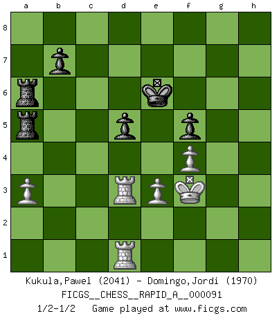 Last move : 1/2-1/2 2010 December 6 11:38:0 [Event "FICGS__CHESS__RAPID_A__000091"] [Site "FICGS"] [Date "2010.10.10"] [Round "1"] [White "Kukula,Pawel"] [Black "Domingo,Jordi"] [Result "1/2-1/2"] [WhiteElo "2041"] [BlackElo "1970"] 1.d4 d5 2.c4 dxc4 3.e3 Nf6 4.Bxc4 e6 5.Nf3 c5 6.O-O a6 7.Bb3 Nc6 8.Nc3 Be7 9.dxc5 Qxd1 10.Rxd1 Bxc5 11.Bd2 Bd7 12.Rac1 Ba7 13.Be1 Ke7 14.Na4 Rhd8 15.Nc5 Bxc5 16.Rxc5 Be8 17.Rdc1 Ne4 18.R5c4 Nd6 19.Rh4 h6 20.Nd4 Rac8 21.Nxc6+ Bxc6 22.Ba5 Rd7 23.Bb4 Ke8 24.Bc3 Bd5 25.Bxd5 exd5 26.Rd1 f5 27.Rf4 Ne4 28.Be1 g6 29.f3 Nf6 30.Bc3 Kf7 31.Rfd4 Rc4 32.R4d3 Ke6 33.Kf2 Ng8 34.h3 h5 35.g3 Ne7 36.f4 Nc8 37.Kf3 Rc5 38.R3d2 Nd6 39.Bb4 Rb5 40.Bxd6 Rxd6 41.g4 hxg4+ 42.hxg4 Ra5 43.gxf5+ gxf5 44.a3 Rb5 45.b4 a5 46.bxa5 Rxa5 47.Rd3 Rda6 1/2-1/2 Queen's gambit accepted Kingside Castling by player White (move 6) This chess game ended in a draw. Follow this game move after move (download)If I win a tournament, I win it by myself. I do the playing. Nobody helps me. (Bobby Fischer) Ein guter Spieler hat immer Glück. (José Raúl Capablanca) Me dio la sensación de como si yo estuviera jugando en contra del mismo Ajedrez. - al estar jugando en contra de Robert Fischer (Walter Shipman) En blitz, le Cavalier l'emporte sur le Fou. (Vlastimil Hort) . 'gn is not allowed in chess unless n is an integer between 1 and 8 inclusive, where 1 and 8 are to interpreted as the standard numerals standing for integers in the ordered real-closed field R, with the *canonical* ordering. (As opposed to, say, an integer in the domain Z[2+i*sqrt(5)] or an integer in some exotic Grothendieck topos). (Normajean Yates)