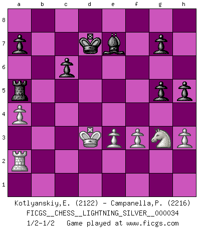 Last move : 1/2-1/2 2010 October 10 20:10:7 [Event "FICGS__CHESS__LIGHTNING_SILVER__000034"] [Site "FICGS"] [Date "2010.10.10"] [Round "1"] [White "Kotlyanskiy,Edward"] [Black "Campanella,Paul"] [Result "1/2-1/2"] [WhiteElo "2122"] [BlackElo "2216"] 1.Nf3 Nf6 2.g3 d5 3.Bg2 c6 4.O-O Bg4 5.h3 Bh5 6.c4 e6 7.d3 dxc4 8.dxc4 Nbd7 9.Nc3 Qa5 10.g4 Bg6 11.Bf4 Qb4 12.Qc1 Qxc4 13.Rd1 h6 14.e3 Qa6 15.Nd2 e5 16.Bh2 Be7 17.Bf1 Bd3 18.Bxd3 Qxd3 19.Nf3 Qg6 20.Qb1 Qxb1 21.Raxb1 h5 22.g5 Nh7 23.g6 fxg6 24.Nxe5 Nxe5 25.Bxe5 Ng5 26.Kg2 Bf6 27.Bf4 Nf7 28.Ne4 g5 29.Bc7 Ke7 30.b4 Rac8 31.Bd6+ Nxd6 32.Rxd6 Rcd8 33.Rxd8 Kxd8 34.Kf3 Be7 35.Ke2 Rf8 36.b5 Kc7 37.bxc6 bxc6 38.a4 Rd8 39.f3 Rd5 40.Ra1 Re5 41.Kd3 Ra5 42.Ra2 Rf5 43.Ke2 Re5 44.Kd3 Kd7 45.Ng3 Ra5 1/2-1/2 Reti Opening Kingside Castling by player White (move 4) This chess game ended in a draw. Follow this game move after move (download)I prefer to lose a really good game than to win a bad one. (David Levy) Ein Teil des Fehlers ist immer korrekt. (Savielly Grigorievitsch Tartakower) Las combinaciones han sido siempre el aspecto más intrigante del Ajedrez. Los Maestros las buscan, el público las aplauden, los críticos las alaban. La razón se debe a que las combinaciones hacen posible que el Ajedrez sea más que un ejercicio matemático con una carencia de vida. Ellas son la poesía del juego, son del Ajedrez lo que la melodía es de la música. Ellas representan el triunfo de la mente sobre la materia. (Reuben Fine) Shah mat. Le roi est mort. Cri de fierté d'un joueur venant de terrasser son adversaire, courtoisement, sans effusion de sang. This is where the fun begins. (Anakin Skywalker in Star Wars ep.3)