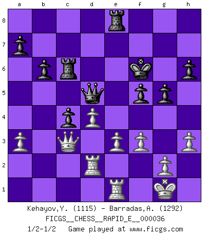 Last move : 1/2-1/2 2010 November 12 19:0:0 [Event "FICGS__CHESS__RAPID_E__000036"] [Site "FICGS"] [Date "2010.10.10"] [Round "1"] [White "Kehayov,Yulian"] [Black "Barradas,Anderson"] [Result "1/2-1/2"] [WhiteElo "1115"] [BlackElo "1292"] 1.d4 d5 2.Nc3 c6 3.Nf3 e6 4.e3 Bb4 5.Bd2 Nf6 6.a3 Bxc3 7.Bxc3 Ne4 8.Bd3 Nxc3 9.bxc3 Nd7 10.O-O Nf6 11.c4 b6 12.cxd5 exd5 13.c4 Bg4 14.cxd5 Qxd5 15.Be2 O-O 16.h3 Bh5 17.Ne5 Bxe2 18.Qxe2 Ne4 19.Qd3 Rfe8 20.Rac1 Rac8 21.Nf3 Nc5 22.Qd1 Nb3 23.Rb1 Na5 24.Qd3 c5 25.Rbd1 c4 26.Qc3 h6 27.Rfe1 f5 28.Nh4 Nc6 29.f3 g5 30.Ng6 Kg7 31.Ne5 Kf6 32.Nxc6 Rxc6 33.Rd2 1/2-1/2 Queen's pawn : Chigorin variation Kingside Castling by player White (move 10) Kingside Castling by player Black (move 15) This chess game ended in a draw. Follow this game move after move (download)The game of Chess is not merely an idle amusement; several very valuable qualities of the mind are to be acquired and strengthened by it, so as to become habits ready on all occasions; for life is a kind of Chess. (Benjamin Franklin) Ich habe Kasparov in Rente geschickt. (Veselin Topalov) Uno no tiene que jugar muy bien, es suficiente jugar mejor que el oponente. (Siegbert Tarrasch) Un footballeur joue avec ses pieds, parfois avec sa tête. Un joueur d'échecs ne joue qu'avec sa tête. Et quand il ne joue plus, il meurt. (Jacob Murray) Faith : not wanting to know what is true. (Friedrich Nietzsche)