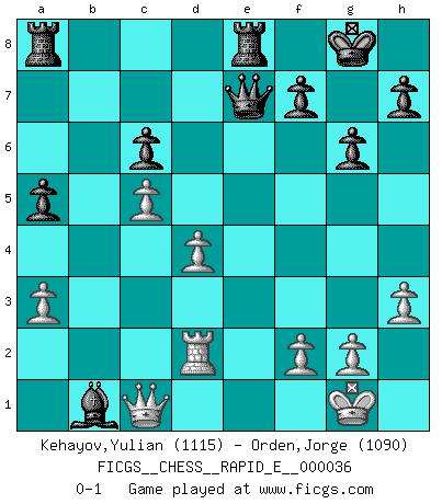 Last move : 0-1 2010 November 16 9:42:10 [Event "FICGS__CHESS__RAPID_E__000036"] [Site "FICGS"] [Date "2010.10.10"] [Round "1"] [White "Kehayov,Yulian"] [Black "Orden,Jorge"] [Result "0-1"] [WhiteElo "1115"] [BlackElo "1090"] 1.d4 d5 2.Nc3 Nf6 3.Nf3 e6 4.e3 Be7 5.Bd3 O-O 6.O-O a6 7.e4 dxe4 8.Nxe4 c5 9.Nxf6+ Bxf6 10.dxc5 Nc6 11.Be3 Bxb2 12.Rb1 Bf6 13.Be4 Qc7 14.Nd4 Rd8 15.c3 e5 16.Bxc6 exd4 17.Bxd4 Bxd4 18.cxd4 bxc6 19.Qa4 Be6 20.Rbd1 Bd5 21.Rd2 Re8 22.a3 a5 23.Qc2 Qe7 24.h3 g6 25.Rb1 Be4 26.Qc1 Bxb1 0-1 Queen's pawn : Chigorin variation Kingside Castling by player Black (move 5) Kingside Castling by player White (move 6) Player Black won this chess game. Follow this game move after move (download)When in doubt... play Chess ! (Tevis) Gewinnen beim Schach fördert das Selbstvertrauen. Beim Sex spüre ich sowas nicht... (Garry Kasparov) Solo puedes ser bueno en el Ajedrez si amas al juego. (Bobby Fischer) La vérité est comme le meilleur coup aux échecs : elle existe, mais il faut la chercher. (Arturo Perez-Reverte) Wawaweewa ! (Borat: Cultural learnings of America for make benefit glorious nation of Kazakhstan)