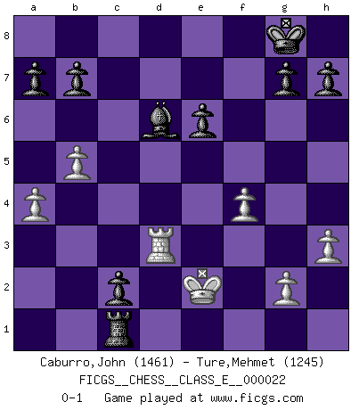 Last move : 0-1 2007 January 7 12:56:1 [Event "FICGS__CHESS__CLASS_E__000022"] [Site "FICGS"] [Date "2006.11.25"] [Round "1"] [White "Caburro,John"] [Black "Ture,Mehmet"] [Result "0-1"] [WhiteElo "1461"] [BlackElo "1245"] 1.d4 d5 2.c4 Nc6 3.Nf3 Bg4 4.e3 Nf6 5.Nc3 e6 6.cxd5 exd5 7.h3 Bd7 8.Bd3 Bd6 9.O-O O-O 10.a3 Ne7 11.b4 c6 12.Rb1 Qc7 13.Bd2 Bf5 14.Qc2 Bxd3 15.Qxd3 Rfe8 16.b5 c5 17.dxc5 Qxc5 18.Rfc1 Qc4 19.Qxc4 dxc4 20.a4 Rac8 21.e4 Ng6 22.Re1 Ne5 23.Nxe5 Bxe5 24.f3 Rcd8 25.Nd5 Nxd5 26.exd5 c3 27.Bc1 c2 28.Rb3 Rxd5 29.Kf1 Re6 30.f4 Bd6 31.Rxe6 fxe6 32.Ke2 Rd1 33.Rd3 Rxc1 0-1 QGD : Chigorin defense Kingside Castling by player White (move 9) Kingside Castling by player Black (move 9) Player Black won this chess game. Follow this game move after move (download)First-class players lose to second-class players because second-class players sometimes play a first-class game. (Siegbert Tarrasch) Schach sollte überall auf der Welt Schulfach werden. Es fördert die geistige Auseinandersetzung. Es lehrt die Demut in der Niederlage. (Garry Kasparov) El Ajedrez es parte de la cultura, y si una cultura esta en decadencia, entonces también el Ajedrez declinará. (Mikhail Botvinnik) Je ne suis pas le dernier à jouer lâchement des coups douteux pendant le zeïtnot de l'adversaire pour l'achever: en effet les coups qui font le plus peur sont ceux que l'on ne comprend pas. Je me fais souvent peur quand je joue. (Un professeur anonyme) As the days dwindle down... to a precious few. (Maxwell Anderson)