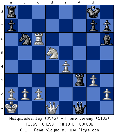 Last move : 0-1 2010 October 27 17:21:19 [Event "FICGS__CHESS__RAPID_E__000036"] [Site "FICGS"] [Date "2010.10.10"] [Round "1"] [White "Melquiades,Jay"] [Black "Frame,Jeremy"] [Result "0-1"] [WhiteElo "0946"] [BlackElo "1185"] 1.e4 e5 2.Nf3 Nf6 3.Nxe5 d6 4.Nxf7 Kxf7 5.Bc4+ Be6 6.Bxe6+ Kxe6 7.Nc3 Kf7 8.d4 Be7 9.Bg5 Rf8 10.Qf3 Kg8 11.O-O-O Nfd7 12.Qg3 Bxg5+ 13.Kb1 Bf4 14.Qg4 Qf6 15.Nd5 Qf7 16.g3 Nb6 17.Nc3 Bh6 18.Rhf1 Nc6 19.d5 Ne5 20.Qe2 c6 21.dxc6 bxc6 22.Rxd6 Nec4 23.Rxc6 Nd2+ 24.Ka1 Nxf1 25.Qxf1 Qxf2 26.Qd1 Rf3 27.Nd5 Qf1 0-1 Petrov : Cochrane gambit Queenside Castling by player White (move 11) Player Black won this chess game. Follow this game move after move (download)Chess teaches you to control the initial excitement you feel when you see something that looks good and it trains you to think objectively when you're in trouble. (Stanley Kubrick) Nach Morphy wurde nichts neues mehr in der Behandlung offener Positionen gefunden. (Mikhail Moiseyevich Botvinik) Aún el Rey más flojo huye despavorido ante la amenaza de un Jaque doble. (Aaron Nimzowitsch) A chaque perte on perd un peu de soi. (Joël Lautier) Don't be irreplaceable, if you can't be replaced, you can't be promoted. (Dan Rotaru)