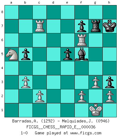 Last move : 1-0 2010 October 18 20:19:6 [Event "FICGS__CHESS__RAPID_E__000036"] [Site "FICGS"] [Date "2010.10.10"] [Round "1"] [White "Barradas,Anderson"] [Black "Melquiades,Jay"] [Result "1-0"] [WhiteElo "1292"] [BlackElo "0946"] 1.e4 e5 2.Nf3 d6 3.d4 Bg4 4.dxe5 a6 5.Be2 Nd7 6.O-O Nxe5 7.Nxe5 Be6 8.Nc4 Nf6 9.Bg5 Be7 10.Nc3 h6 11.Bxf6 Bxf6 12.Rb1 b5 13.Na5 O-O 14.Bf3 Qe7 15.e5 dxe5 16.Bxa8 Rxa8 17.Re1 Bd7 18.Nd5 Qd6 19.b3 Qc5 20.Nb7 Qc6 21.Nxf6+ gxf6 22.Na5 Qe6 23.a4 Kh7 24.axb5 Rg8 25.Qf3 Qh3 26.Qxh3 Bxh3 27.g3 h5 28.Re4 Bf5 29.Rc4 axb5 30.Rxc7 Rg7 31.Rd1 h4 32.Rd6 h3 33.Rxf6 1-0 Philidor's defense Kingside Castling by player White (move 6) Kingside Castling by player Black (move 13) Player White won this chess game. Follow this game move after move (download)On the chessboard, lies and hypocrisy do not survive long. (Emanuel Lasker) Mein Name ist Rustam Kamsky. Sie haben meinen Sohn belästigt. Bereiten Sie sich aufs Sterben vor. (Rustam Kamsky) Yo siempre he tenido un ligero sentimiento de lástima por una persona que no tiene conocimiento del Ajedrez. (Siegbert Tarrasch) Il vaut mieux sacrifier les pièces de l'adversaire. (Xavier Tartacover) Pushing plastic is for the many, pushing virtual pieces is for the fewer, pushing wood is for the very few. (Normajean Yates)