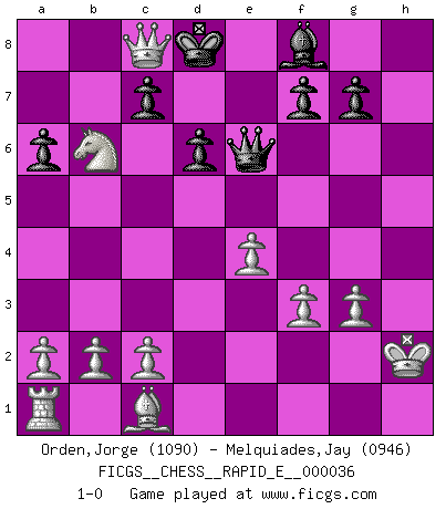 Last move : 1-0 2010 October 27 17:13:32 [Event "FICGS__CHESS__RAPID_E__000036"] [Site "FICGS"] [Date "2010.10.10"] [Round "1"] [White "Orden,Jorge"] [Black "Melquiades,Jay"] [Result "1-0"] [WhiteElo "1090"] [BlackElo "0946"] 1.e4 e5 2.Nf3 d6 3.h3 Nf6 4.Nc3 a6 5.Be2 Nc6 6.O-O h5 7.d4 Ng4 8.hxg4 hxg4 9.g3 gxf3 10.Bxf3 exd4 11.Nd5 Bh3 12.Bg2 Bxg2 13.Kxg2 Ne5 14.Qxd4 Ng4 15.f3 Nh2 16.Rh1 Qd7 17.Rxh2 Rxh2+ 18.Kxh2 O-O-O 19.Qa7 Qe6 20.Qa8+ Kd7 21.Qxb7 Rc8 22.Nb6+ Kd8 23.Qxc8+ 1-0 Philidor's defense Kingside Castling by player White (move 6) Queenside Castling by player Black (move 18) Player White won this chess game. Follow this game move after move (download)I have added these principles to the law: get the Knights into action before both Bishops are developed. (Emanuel Lasker) Man braucht nicht immer den besten Zug zu spielen: Ein Zug muß aktiv, unternehmungslustig, korrekt und schön sein. (David Bronstein) Aún deseo matar a Fischer. (Boris Spassky) Comme les marins qui ont mille raisons différentes d'aller en mer, les joueurs d'échecs en ont tout autant avant de s'installer devant une table et jouer... (Vincent Bertignac, philosophe) When you have everything, sometimes it feels like nothing. (Horatio Caine, C.S.I. Miami)