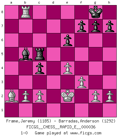 Last move : 1-0 2010 October 18 12:40:59 [Event "FICGS__CHESS__RAPID_E__000036"] [Site "FICGS"] [Date "2010.10.10"] [Round "1"] [White "Frame,Jeremy"] [Black "Barradas,Anderson"] [Result "1-0"] [WhiteElo "1185"] [BlackElo "1292"] 1.e4 c5 2.Nf3 e6 3.d4 cxd4 4.Nxd4 Bc5 5.Be3 d6 6.Nc3 a6 7.Bc4 b5 8.Bb3 Bb7 9.f3 Nc6 10.Nxc6 Bxc6 11.Bxc5 dxc5 12.Qxd8+ Rxd8 13.a4 c4 14.Ba2 Ne7 15.axb5 axb5 16.O-O O-O 17.Rfd1 Nc8 18.Kf1 Nb6 19.Ke2 Rfe8 20.Rxd8 Rxd8 21.Rd1 Re8 22.Rd6 Rc8 23.Nxb5 Bxb5 24.Rxb6 Rc5 25.Rb8+ 1-0 Sicilian defense Kingside Castling by player White (move 16) Kingside Castling by player Black (move 16) Player White won this chess game. Follow this game move after move (download)I had a toothache during the first game. In the second game I had a headache. In the third game it was an attack of rheumatism. In the fourth game, I wasn't feeling well. And in the fifth game? Well, must one have to win every game ? (Siegbert Tarrasch) Ich könnte leicht behaupten: Ja,ja, Leonid Breschnew wollte nicht, daß ich Weltmeister werde. In der Tat war die Sache komplizierter. (Viktor Kortschnoi) El Ajedrez es tan interesante por sí solo, que no es necesario un interés monetario para persuadir a una persona a que lo practique; por lo tanto, nunca se juega por dinero. (Benjamin Franklin) C'est une question de caractère, Beaucoup de gens perdent leur motivation très vite. D'autres, ils sont rares, peuvent la conserver très longtemps. J'aime les échecs, encore aujourd'hui je suis heureux d'analyser des parties. J'aime toujours gagner, je déteste encore perdre. Bien jouer est important pour mon intégrité intellectuelle et morale. Et puis les échecs vivent en ce moment une période historique grâce à Internet. Ils se développent dans les systèmes éducatifs à travers le monde. Ils sortent de leur ghetto, et c'est mon rôle de mener à bien cette révolution. (Gary Kasparov) Man with more than one clock never knows what time it is. (Chinese thought)