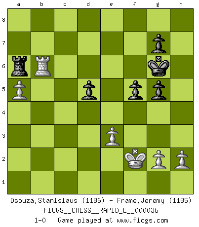 Last move : 1-0 2010 November 10 17:23:16 [Event "FICGS__CHESS__RAPID_E__000036"] [Site "FICGS"] [Date "2010.10.10"] [Round "1"] [White "Dsouza,Stanislaus"] [Black "Frame,Jeremy"] [Result "1-0"] [WhiteElo "1186"] [BlackElo "1185"] 1.e4 e5 2.Nf3 Nf6 3.Nxe5 d6 4.Nf3 Nxe4 5.d4 d5 6.Bd3 Bf5 7.O-O Bg6 8.Ne5 Nd7 9.Nxd7 Qxd7 10.Bxe4 Bxe4 11.Nc3 Bg6 12.Be3 Be7 13.Re1 O-O 14.Ne2 Rac8 15.c3 f5 16.Nf4 Rce8 17.Nxg6 hxg6 18.Qb3 Bf6 19.Rad1 b6 20.c4 c6 21.cxd5 Qxd5 22.Qxd5+ cxd5 23.Rc1 Re6 24.Rc7 Bxd4 25.Rxa7 Bxe3 26.Rxe3 Rxe3 27.fxe3 Rd8 28.Rb7 Rd6 29.Kf2 g5 30.b4 Kh7 31.a4 Kg6 32.a5 bxa5 33.bxa5 Ra6 34.Rb6+ 1-0 Petrov : Classical attack Kingside Castling by player White (move 7) Kingside Castling by player Black (move 13) Player White won this chess game. Follow this game move after move (download)Chess is life. (Bobby Fischer) Schachspieler können ausgezeichnet Varianten am Schachbrett berechnen, aber nicht im realen Leben. Zu stark ist der Individualismus im Schach ausgeprägt, und für viele ist ein kleiner momentaner persönlicher Vorteil wichtiger als ein weit größerer Vorteil von morgen. (Anatoly Karpov) Yo nunca en mi vida he jugado la Defensa Francesa, que viene siendo la más aburrida de todas las Aperturas. (Wilhelm Steinitz) Shah mat. Le roi est mort. Cri de fierté d'un joueur venant de terrasser son adversaire, courtoisement, sans effusion de sang. Real knowledge is to know the extent of one's ignorance. (Confucius)