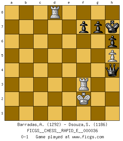Last move : 0-1 2010 October 27 14:42:53 [Event "FICGS__CHESS__RAPID_E__000036"] [Site "FICGS"] [Date "2010.10.10"] [Round "1"] [White "Barradas,Anderson"] [Black "Dsouza,Stanislaus"] [Result "0-1"] [WhiteElo "1292"] [BlackElo "1186"] 1.e4 e5 2.Nf3 Nc6 3.Bb5 d6 4.O-O Bd7 5.c3 Nf6 6.Re1 Be7 7.d3 a6 8.Ba4 Na7 9.Nbd2 O-O 10.Nc4 Bxa4 11.Qxa4 b5 12.Qxa6 bxc4 13.Qxc4 c5 14.d4 cxd4 15.cxd4 exd4 16.Nxd4 Nxe4 17.Nc6 Nxc6 18.Qxc6 Nf6 19.Bg5 h6 20.Bxf6 Bxf6 21.Rad1 Rc8 22.Qa6 Bxb2 23.Rxd6 Qc7 24.g3 Rfe8 25.Rb1 Qc2 26.Qf1 Be5 27.Rdb6 Qxa2 28.R6b5 Bf6 29.h4 Re2 30.Rf5 R8c2 31.Rd1 Qc4 32.Rf4 Qe6 33.h5 Be5 34.Rf3 Qg4 35.Kg2 Bxg3 36.Rd8+ Kh7 37.Rxg3 Rxf2+ 38.Qxf2 Rxf2+ 39.Kxf2 Qf4+ 40.Rf3 Qh4+ 0-1 Ruy Lopez : Old Steinitz defense Kingside Castling by player White (move 4) Kingside Castling by player Black (move 9) 10 pieces endgame at move 38 : White KRRP , Black KQRPPP WHITE : King + 2 Rooks 1 Pawn BLACK : King + 1 Queen 1 Rook 3 Pawns 9 pieces endgame at move 39 : White KRRP , Black KQPPP WHITE : King + 2 Rooks 1 Pawn BLACK : King + 1 Queen 3 Pawns Player Black won this chess game. Follow this game move after move (download)If Chess is a science, it's a most inexact one. If Chess is an art, it is too exacting to be seen as one. If Chess is a sport, it's too esoteric. If Chess is a game, it's too demanding to be just a game. If Chess is a mistress, she's a demanding one. If Chess is a passion, it's a rewarding one. If Chess is life, it's a sad one. (Unknown) Man wirke der falschen Auffassung entgegen, als ob jeder Zug Unmittelbares zu leisten habe; auch Werte- und Ruhezüge haben ihre Existenzberechtigung. (Aaron Nimzowitsch) En el Ajedrez, cuando menos, el valiente hereda la tierra. (Edmar Mednis) Une platitude souvent récitée à propos des Echecs est qu'une des choses les plus difficiles à réaliser est de gagner une position gagnante. Cela ne manque pas de sens mais, pour ma part, j'ai toujours trouvé plus difficile de gagner une position perdante. (Tim Krabbe) It's not a bug - it's an undocumented feature. (Anonymous)
