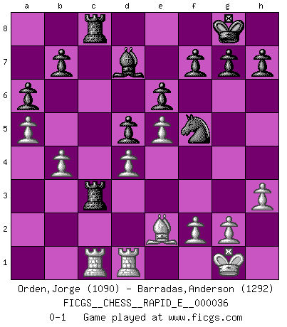 Last move : 0-1 2010 October 24 4:58:13 [Event "FICGS__CHESS__RAPID_E__000036"] [Site "FICGS"] [Date "2010.10.10"] [Round "1"] [White "Orden,Jorge"] [Black "Barradas,Anderson"] [Result "0-1"] [WhiteElo "1090"] [BlackElo "1292"] 1.e4 c5 2.Nf3 e6 3.d4 cxd4 4.Nxd4 Bc5 5.c3 Qf6 6.Be2 Nc6 7.Be3 Nge7 8.b4 Bxd4 9.Bxd4 Nxd4 10.Qxd4 Qxd4 11.cxd4 O-O 12.O-O d5 13.e5 Nf5 14.Rd1 a6 15.a4 Bd7 16.Nc3 Rac8 17.Rac1 Rc7 18.h3 Rfc8 19.a5 Rxc3 0-1 Sicilian defense Kingside Castling by player Black (move 11) Kingside Castling by player White (move 12) Player Black won this chess game. Follow this game move after move (download)Many Chess players were surprised when after the game, Fischer quietly explained: 'I had already analyzed this possibility' in a position which I thought was not possible to foresee from the opening. (Mikhail Tal) Ein Isolani verdüstert die Stimmung auf dem ganzen Schachbrett. (Savielly Grigorievitsch Tartakower) No nos podemos resistir a la fascinación de un sacrificio ya que la pasión por los sacrificios es parte de la naturaleza de un jugador de Ajedrez. (Rudolf Spielman) Vous n'êtes pas toujours obligé de jouer le meilleur coup. Un coup doit être actif, entreprenant, correct et beau ! (David Bronstein) The good fighters of old first put themselves beyond the possibility of defeat, and then waited for an opportunity of defeating the enemy. (Sun Tzu)