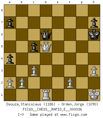 Last move : 1-0 2010 November 26 17:35:52 [Event "FICGS__CHESS__RAPID_E__000036"] [Site "FICGS"] [Date "2010.10.10"] [Round "1"] [White "Dsouza,Stanislaus"] [Black "Orden,Jorge"] [Result "1-0"] [WhiteElo "1186"] [BlackElo "1090"] 1.e4 c5 2.Nf3 d6 3.Bc4 g6 4.O-O Bg7 5.Re1 Nc6 6.c3 e6 7.d4 Nge7 8.d5 Na5 9.Be2 b6 10.Be3 O-O 11.Na3 Bb7 12.Nc4 Ba6 13.Nxa5 Bxe2 14.Qxe2 bxa5 15.Rad1 exd5 16.exd5 Nf5 17.Bf4 Qd7 18.h3 Rfe8 19.Qd2 a4 20.Rxe8+ Rxe8 21.g4 f6 22.gxf5 Qxf5 23.Kh2 g5 24.Nxg5 fxg5 25.Bxg5 Qe5+ 26.Bf4 Qe2 27.Bxd6 Be5+ 28.Bxe5 Qxe5+ 29.Kg1 Qd6 30.Qg5+ Kh8 31.Kh1 Re5 32.Qg4 Rxd5 33.Qc8+ Kg7 34.Qb7+ Kh6 35.Qxd5 1-0 Sicilian Kingside Castling by player White (move 4) Kingside Castling by player Black (move 10) Player White won this chess game. Follow this game move after move (download)Every Chess master was once a beginner. (Chernev) Ja, jede Frau in Holland liebt mich bestimmt, und alle Männer hassen mich. (Loek van Wely) El Ajedrez es el gimnasio de la mente. (Blaise Pascal) La conception d'un plan est le processus par lequel un joueur exploite les avantages de sa position tout en s'efforçant d'en réduire au minimum les inconvénients. Afin de garantir le succès, un plan doit toujours se fonder sur un diagnostic objectif des particularités d'une position. La conception d'un plan est d'autant plus difficile que la position est équilibrée, et grandement facilitée lorsqu'il n'existe qu'un seul plan susceptible de répondre aux exigences de la position. (Harry Golombek) The question of whether computers can think is just like question of whether submarines can swim. (Edsger W. Dijkstra)