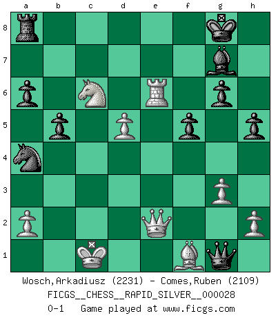 Last move : 0-1 2011 January 2 3:49:1 [Event "FICGS__CHESS__RAPID_SILVER__000028"] [Site "FICGS"] [Date "2010.10.11"] [Round "1"] [White "Wosch,Arkadiusz"] [Black "Comes,Ruben"] [Result "0-1"] [WhiteElo "2231"] [BlackElo "2109"] 1.e4 c5 2.Nf3 d6 3.d4 cxd4 4.Nxd4 Nf6 5.Nc3 a6 6.Be3 e5 7.Nb3 Be6 8.f3 h5 9.Qd2 Nbd7 10.O-O-O Qc7 11.f4 b5 12.Nd5 Bxd5 13.exd5 Ng4 14.Re1 g6 15.fxe5 Ngxe5 16.Qa5 Qb7 17.Bf4 Bg7 18.Qa3 O-O 19.Qxd6 Rfe8 20.Na5 Qc8 21.Qb4 Nb6 22.Bxe5 Bxe5 23.g3 Bg7 24.Bg2 Na4 25.c3 Qf5 26.Qf4 Qd3 27.Qd2 Rxe1+ 28.Rxe1 Nxb2 29.Qc2 Bxc3 30.Re4 f5 31.Re6 Qd4 32.Bf1 Na4 33.Nc6 Qg1 34.Qe2 Bg7 0-1 Sicilian : Najdorf, Byrne (English) attack Queenside Castling by player White (move 10) Kingside Castling by player Black (move 18) Player Black won this chess game. Follow this game move after move (download)Fischer is an American Chess tragedy on par with Morphy and Pillsbury. (Mig Greengard) Du musst nicht gut spielen, es reicht, wenn du besser spielst als dein Gegner. (Anonymous) Entre mas años cumplo, mas valoro los Peones. (Keres) Un journaliste : 'Vous préférez avoir une dame de plus sur l'échiquier ou au lit ?' Boris Spassky : 'Ca dépend de la position.' Warrior pose battles inner weakness and wins focus. You see that there is no war within you. You're on your own side, and you are your own strength. (Terri Guillemets)