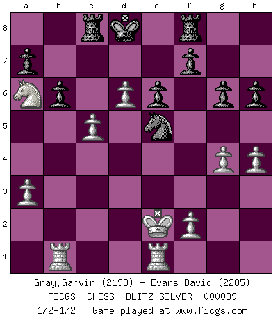 Last move : 1/2-1/2 2010 October 11 13:41:44 [Event "FICGS__CHESS__BLITZ_SILVER__000039"] [Site "FICGS"] [Date "2010.10.11"] [Round "1"] [White "Gray,Garvin"] [Black "Evans,David"] [Result "1/2-1/2"] [WhiteElo "2198"] [BlackElo "2205"] 1.e4 e6 2.d4 d5 3.e5 c5 4.c3 Qb6 5.Nf3 Bd7 6.a3 Bb5 7.c4 Bxc4 8.Bxc4 dxc4 9.d5 Ne7 10.d6 Nec6 11.Nbd2 Qa6 12.Qe2 c3 13.bxc3 Qxe2+ 14.Kxe2 Nd7 15.Rb1 Rb8 16.Ne4 h6 17.c4 g6 18.Re1 Bg7 19.Bb2 Kd8 20.g4 Rf8 21.h4 Ncxe5 22.Nxe5 Bxe5 23.Bxe5 Nxe5 24.Nxc5 b6 25.Na6 Rc8 26.c5 1/2-1/2 French : Advance, Wade variation This chess game ended in a draw. Follow this game move after move (download)The Pin is mightier than the sword. (Fred Reinfeld) Wer nie einen Fehler gemacht hat, hat nie etwas Neues ausprobiert. (Albert Einstein) La caracteristica mas importante en la posición del Ajedrez es la actividad de las piezas. Esto es absolutamente fundamental en todas las fases del juego: Apertura, Juego Medio y especialmente Finales. La limitación primordial en la actividad de una pieza, es la estructuración de los Peones. (Michael Stean) Il n'y a pas de prix trop élevé au scalp de l'ennemi. (Koblentz) To send light into the darkness of men's hearts - such is the duty of the artist. (Schumann)