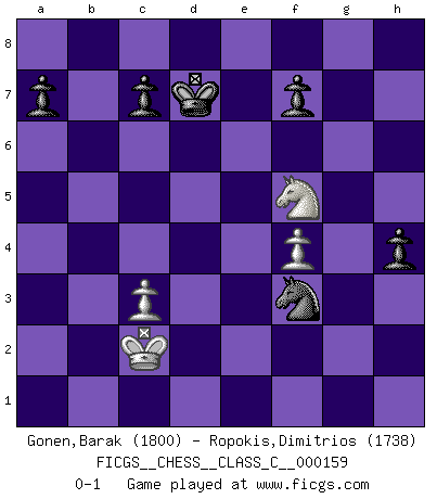 Last move : 0-1 2011 March 17 12:20:39 [Event "FICGS__CHESS__CLASS_C__000159"] [Site "FICGS"] [Date "2010.10.12"] [Round "1"] [White "Gonen,Barak"] [Black "Ropokis,Dimitrios"] [Result "0-1"] [WhiteElo "1800"] [BlackElo "1738"] 1.c4 Nf6 2.Nc3 e6 3.e4 Nc6 4.Nf3 d5 5.e5 Ne4 6.cxd5 exd5 7.Qb3 Nc5 8.Qxd5 Bg4 9.Bb5 Qxd5 10.Nxd5 O-O-O 11.Bxc6 Bxf3 12.gxf3 Nd3+ 13.Ke2 Nxe5 14.Bxb7+ Kxb7 15.Ne3 Nd3 16.Rb1 g6 17.b4 Bg7 18.Rb3 Nf4+ 19.Kd1 Rd3 20.Rb1 Rhd8 21.Rf1 Ne6 22.b5 h5 23.Rh1 R3d4 24.Nc2 Ra4 25.Re1 Rxa2 26.Nb4 Ra1 27.Rxa1 Bxa1 28.Re3 Bg7 29.f4 Rd4 30.f5 gxf5 31.Ba3 Bh6 32.Rd3 Rxd3 33.Nxd3 Bg7 34.Bb4 Kb6 35.Bc3 Bxc3 36.dxc3 Kxb5 37.Ne5 Ng5 38.Kc2 Kc5 39.Nd7+ Kd6 40.Nf6 h4 41.f4 Nf3 42.Ne8+ Kd7 43.Ng7 Nxh2 44.Nxf5 Nf3 0-1 English : Mikenas-Carls, Kevitz variation Queenside Castling by player Black (move 10) 10 pieces endgame at move 44 : White KNPP , Black KNPPPP WHITE : King + 1 Knight 2 Pawns BLACK : King + 1 Knight 4 Pawns Player Black won this chess game. Follow this game move after move (download)The older I grow, the more I value pawns. (Paul Keres) Ich brauche nur einen Blick auf das Schachbrett zu werfen, und weiß schon, was in der Stellung steckt, was geschehen kann und was geschehen wird. Alle übrigen suchen und prüfen, ich aber weiß es! (José Raúl Capablanca) ¿Esta Bobby Fischer algo cuerdo?. (Salo Flohr) Botvinnik disait en comparant les échecs à la musique: Il existe une science dont le but est l'étude de l'acoustique et des sons. Mais il y a aussi un art qui se sert de l'océan des sons : c'est la musique. De toute évidence, il en est de même pour la pensée. La logique est l'étude des lois de la réflexion et les échecs reflètent, en tant qu'art, le côté logique de la réflexion, sous la forme d'images artistiques... Extrait de Fischer - Spassky, Reykjavik 1972 par Alexander & F. Wyndham (Ed. Solar), p 37. Somewhere in the world there is an epigram for every dilemma. (Hendrik Willem van Loon)