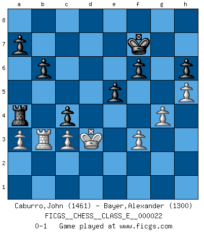 Last move : 0-1 2007 January 7 18:4:8 [Event "FICGS__CHESS__CLASS_E__000022"] [Site "FICGS"] [Date "2006.11.25"] [Round "1"] [White "Caburro,John"] [Black "Bayer,Alexander"] [Result "0-1"] [WhiteElo "1461"] [BlackElo "1300"] 1.d4 d5 2.c4 e6 3.Nc3 Nf6 4.Bg5 Bb4 5.Nf3 dxc4 6.e4 h6 7.Bxf6 Qxf6 8.Bxc4 O-O 9.O-O Nc6 10.e5 Qd8 11.a3 Bxc3 12.bxc3 Bd7 13.Rb1 Rb8 14.Bb3 Ne7 15.Bc2 Bc6 16.Qd3 Ng6 17.h4 f5 18.exf6 Rxf6 19.Ne5 Nxe5 20.Qh7+ Kf7 21.dxe5 Qd5 22.Be4 Qxe4 23.Qxe4 Bxe4 24.exf6 Bxb1 25.Rxb1 gxf6 26.f3 b6 27.Kf2 Rd8 28.Ke3 Rd5 29.g3 e5 30.g4 Ra5 31.Rb3 Ra4 32.Kd3 Rf4 33.Ke3 c5 34.h5 Ra4 35.Kd3 c4+ 0-1 QGD : 4.Bg5 Kingside Castling by player Black (move 8) Kingside Castling by player White (move 9) Player Black won this chess game. Follow this game move after move (download)Chess is played with the mind and not with the hands ! (Renaud and Kahn) Du kannst im Schach nur gut werden, wenn du das Spiel liebst. (Robert James Fischer) El ganar no lo es todo... pero el perder es nada. (Mednis) Le plus grand jeu de l'esprit jamais inventé, plus vous l'apprenez, plus vous y prenez du plaisir. (Garry Kasparov) Fame, I have already. Now I need the money. (an elderly Steinitz)