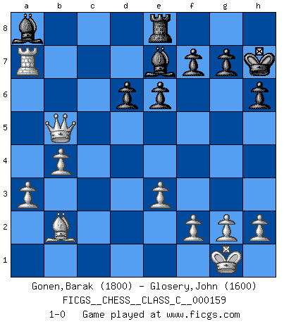 Last move : 1-0 2010 October 25 8:45:39 [Event "FICGS__CHESS__CLASS_C__000159"] [Site "FICGS"] [Date "2010.10.12"] [Round "1"] [White "Gonen,Barak"] [Black "Glosery,John"] [Result "1-0"] [WhiteElo "1800"] [BlackElo "1600"] 1.d4 Nf6 2.c4 e6 3.Nf3 b5 4.cxb5 a6 5.e3 Bb7 6.bxa6 Nxa6 7.a3 Be7 8.Bb5 O-O 9.O-O c5 10.Nc3 cxd4 11.Nxd4 Nc7 12.Bd3 Rc8 13.b4 Ncd5 14.Nxd5 Nxd5 15.Bb2 Nf6 16.Qe2 Re8 17.Nb3 d6 18.Na5 Ba8 19.Rac1 h6 20.Rxc8 Qxc8 21.Rc1 Qb7 22.Nxb7 Bxb7 23.Rc7 Ba8 24.Ra7 Nh7 25.Bxh7+ Kxh7 26.Qb5 1-0 Queen's pawn game Kingside Castling by player Black (move 8) Kingside Castling by player White (move 9) Player White won this chess game. Follow this game move after move (download)After a bad opening, there is hope for the middle game. After a bad middle game, there is hope for the endgame. But once you are in the endgame, the moment of truth has arrived. (Edmar Mednis) Schach sollte überall auf der Welt Schulfach werden. Es fördert die geistige Auseinandersetzung. Es lehrt die Demut in der Niederlage. (Garry Kasparov) El Ajedrez es parte de la cultura, y si una cultura esta en decadencia, entonces también el Ajedrez declinará. (Mikhail Botvinnik) Plusieurs personnes se sont demandées comment Tal faisait pour gagner... En fait, c'est très simple ! Il met ses pièces au centre de l'échiquier et les sacrifie quelque part ! (David Bronstein) Chess is everything: art, science and sport. (Anatoly Karpov)