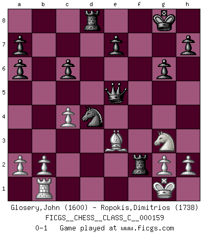 Last move : 0-1 2010 October 16 22:19:45 [Event "FICGS__CHESS__CLASS_C__000159"] [Site "FICGS"] [Date "2010.10.12"] [Round "1"] [White "Glosery,John"] [Black "Ropokis,Dimitrios"] [Result "0-1"] [WhiteElo "1600"] [BlackElo "1738"] 1.e4 c6 2.f4 d6 3.Nf3 g6 4.d4 Bg7 5.Be2 Nf6 6.Nbd2 O-O 7.O-O Na6 8.Bxa6 bxa6 9.e5 Nd5 10.Ne4 Bf5 11.Ng3 Bg4 12.c4 Nc7 13.Qe1 Bxf3 14.Rxf3 dxe5 15.dxe5 f6 16.Re3 fxe5 17.fxe5 Qd4 18.Qe2 Bh6 19.Kh1 Bxe3 20.Bxe3 Qxe5 21.Rd1 Rad8 22.Rb1 Ne6 23.Kg1 Nd4 24.Qf2 Rxf2 0-1 Caro-Kann defense Kingside Castling by player Black (move 6) Kingside Castling by player White (move 7) Player Black won this chess game. Follow this game move after move (download)A passed Pawn increases in strength as the number of pieces on the board diminishes. (Capablanca) Ich habe Kasparov in Rente geschickt. (Veselin Topalov) El Jaque al descubierto es el bombardero del tablero. (Reuben Fine) On est toujours la mazette de quelqu'un d'autre. (Anonyme) Everything in life is luck. (Donald Trump)