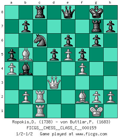Last move : 1/2-1/2 2010 December 6 19:28:24 [Event "FICGS__CHESS__CLASS_C__000159"] [Site "FICGS"] [Date "2010.10.12"] [Round "1"] [White "Ropokis,Dimitrios"] [Black "von Buttlar,Paul"] [Result "1/2-1/2"] [WhiteElo "1738"] [BlackElo "1683"] 1.e4 e6 2.d4 d5 3.Nd2 Nf6 4.e5 Nfd7 5.f4 c5 6.Ngf3 Nc6 7.c3 a5 8.a4 cxd4 9.cxd4 Bb4 10.Bd3 Qb6 11.O-O Nxd4 12.Kh1 Nc6 13.Nb3 f6 14.Nfd4 Nxd4 15.Be3 O-O 16.Bxd4 Qd8 17.Qc2 f5 18.Rac1 Nb8 19.Qf2 Nc6 20.Bb6 Qe8 21.Nc5 Bd7 22.Nxd7 Qxd7 23.Bc5 Rfc8 24.Bb6 Rf8 25.Rc2 Rac8 26.Rfc1 Qe8 27.Qf3 Qe7 28.Bb5 Rf7 29.Qd3 Qe8 30.Bd4 g6 31.Kg1 Rfc7 32.Bf2 Rg7 33.Qd4 Rgc7 34.Qd3 Rg7 35.Be3 Rgc7 36.Bb6 Rg7 37.Bf2 1/2-1/2 French : Tarrasch, Closed variation Kingside Castling by player White (move 11) Kingside Castling by player Black (move 15) This chess game ended in a draw. Follow this game move after move (download)What is the object of playing a gambit opening?... To acquire a reputation of being a dashing player at the cost of losing a game. (Siegbert Tarrasch) Schach ist gnadenlos. Du mußt bereit sein zu töten. (Nigel Short) La esencia del Ajedrez es pensar acerca de lo que el Ajedrez es. (David Bronstein) Les pièces de l'échiquier étaient impitoyables. Elles le retenaient, elles l'absorbaient. Il y avait de l'horreur en cela, mais aussi une harmonie unique. Car, qu'y a-t-il dans le monde, à part les échecs ? (V. Nabokov) I can't decide which is riskier; taking crazy risks, or taking advice on crazy risks from a crazy risk taker. (Gregory House in House M.D.)