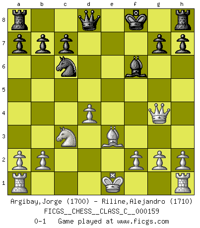 Last move : 0-1 2010 December 29 22:57:40 [Event "FICGS__CHESS__CLASS_C__000159"] [Site "FICGS"] [Date "2010.10.12"] [Round "1"] [White "Argibay,Jorge"] [Black "Riline,Alejandro"] [Result "0-1"] [WhiteElo "1700"] [BlackElo "1710"] 1.d4 d5 2.c4 dxc4 3.e3 e5 4.Nc3 exd4 5.exd4 Nf6 6.Bxc4 Be7 7.Nf3 Bg4 8.Bxf7+ Kxf7 9.Ne5+ Kf8 10.Nxg4 Nxg4 11.Qxg4 Nc6 12.Be3 Bf6 0-1 Queen's gambit accepted Player Black won this chess game. Follow this game move after move (download)For surely of all the drugs in the world, Chess must be the most permanently pleasurable. (Assiac) Ein Schachspiel besteht aus drei Phasen: Die erste, wenn du hofftst den Vorteil zu haben, die zweite, wenn du glaubst einen Vorteil zu haben, und die dritte.... wenn du weißt Du wirst verlieren. (Savielly Grigorievitsch Tartakower) Aquel que ve no otra dirección en el juego que la de dar Jaque Mate a su oponente, nunca será un buen jugador de Ajedrez. (Euwe) Le thème de l'attaque double intervient d'une manière ou d'une autre dans l'immense majorité des combinaisons. (Youri Averbakh) There are two major products that came out of Berkeley: LSD and UNIX. We do not believe this is to be a coincidence. (Jeremy S. Anderson)