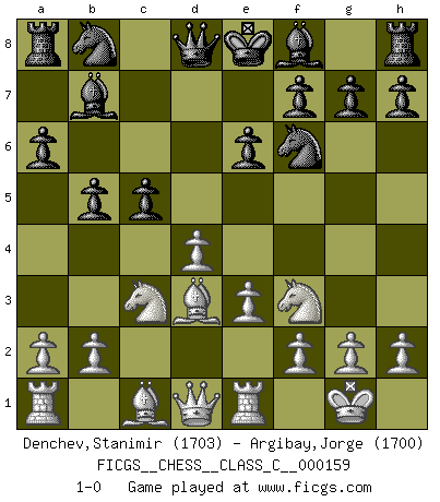 Last move : 1-0 2010 December 8 22:25:52 [Event "FICGS__CHESS__CLASS_C__000159"] [Site "FICGS"] [Date "2010.10.12"] [Round "1"] [White "Denchev,Stanimir"] [Black "Argibay,Jorge"] [Result "1-0"] [WhiteElo "1703"] [BlackElo "1700"] 1.d4 d5 2.c4 dxc4 3.e3 Nf6 4.Bxc4 e6 5.Nf3 a6 6.O-O c5 7.Nc3 b5 8.Bd3 Bb7 9.Re1 1-0 This chess game has been lost on time (started : 2010.10.12 13:27:23) Queen's gambit accepted Kingside Castling by player White (move 6) Player White won this chess game. Follow this game move after move (download)Chess is not like life... it has rules ! (Mark Pasternak) Nach Morphy wurde nichts neues mehr in der Behandlung offener Positionen gefunden. (Mikhail Moiseyevich Botvinik) Las combinaciones han sido siempre el aspecto más intrigante del Ajedrez. Los Maestros las buscan, el público las aplauden, los críticos las alaban. La razón se debe a que las combinaciones hacen posible que el Ajedrez sea más que un ejercicio matemático con una carencia de vida. Ellas son la poesía del juego, son del Ajedrez lo que la melodía es de la música. Ellas representan el triunfo de la mente sobre la materia. (Reuben Fine) Il s'avisa de me proposer d'apprendre les échecs qu'il jouait un peu... me voilà forcené des échecs. J'achète un échiquier, je m'enferme dans ma chambre, j'y passe des jours et des nuits à vouloir apprendre par cur toutes les parties. (Jean-Jacques Rousseau, Confessions) The only difference between a tax man and a taxidermist is that the taxidermist leaves the skin. (Mark Twain)