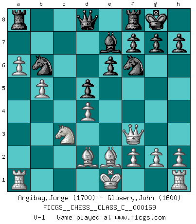 Last move : 0-1 2010 December 29 22:57:40 [Event "FICGS__CHESS__CLASS_C__000159"] [Site "FICGS"] [Date "2010.10.12"] [Round "1"] [White "Argibay,Jorge"] [Black "Glosery,John"] [Result "0-1"] [WhiteElo "1700"] [BlackElo "1600"] 1.d4 Nf6 2.c4 e6 3.Nf3 b5 4.cxb5 a6 5.e3 Bb7 6.Nc3 Bb4 7.Bd2 O-O 8.a3 Be7 9.b4 d6 10.bxa6 Nxa6 11.b5 Nb8 12.a4 Nbd7 13.a5 c5 14.a6 Bxf3 15.Qxf3 cxd4 16.exd4 d5 17.Be2 Nb6 0-1 Queen's pawn game Kingside Castling by player Black (move 7) Player Black won this chess game. Follow this game move after move (download)Chess is mental torture. (Garry Kasparov) Mein Name ist Rustam Kamsky. Sie haben meinen Sohn belästigt. Bereiten Sie sich aufs Sterben vor. (Rustam Kamsky) Todavía soy una víctima del Ajedrez. Tiene toda la belleza del arte y mucho mas. No puede ser comercializado. El Ajedrez es mas puro que el arte en su posición social. (Marcel Duchamp) Des points faibles ou des trous dans la position de l'adversaire doivent être occupés par des pièces et non pas par des pions. (Siegbert Tarrasch) Memory is a complicated thing, a relative to truth, but not its twin. (Barbara Kingsolver, Animal Dreams)