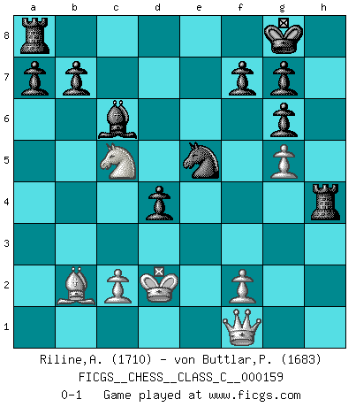 Last move : 0-1 2010 November 28 17:17:16 [Event "FICGS__CHESS__CLASS_C__000159"] [Site "FICGS"] [Date "2010.10.12"] [Round "1"] [White "Riline,Alejandro"] [Black "von Buttlar,Paul"] [Result "0-1"] [WhiteElo "1710"] [BlackElo "1683"] 1.e4 e6 2.d4 d5 3.Nc3 Bb4 4.exd5 exd5 5.Qf3 c6 6.a3 Ba5 7.Bd3 Qf6 8.b4 Qxd4 9.Nge2 Bxb4 10.Nxd4 Bxc3+ 11.Bd2 Bxa1 12.Nb3 Bf6 13.O-O Ne7 14.g4 O-O 15.g5 Bb2 16.Bb4 Re8 17.Rb1 Be5 18.Re1 Ng6 19.Bxg6 hxg6 20.h4 Bf5 21.Rxe5 Rxe5 22.Bc3 Re4 23.Nd4 Bd7 24.Bb2 c5 25.Nb3 Rg4+ 26.Kf1 Bb5+ 27.Ke1 Re4+ 28.Kd2 Nd7 29.a4 Bxa4 30.Qc3 d4 31.Qc4 Bc6 32.Nxc5 Ne5 33.Qf1 Rxh4 0-1 French : Winawer (Nimzovich) variation Kingside Castling by player White (move 13) Kingside Castling by player Black (move 14) Player Black won this chess game. Follow this game move after move (download)I don't believe in psychology. I believe in good moves. (Bobby Fischer) Schachspieler können ausgezeichnet Varianten am Schachbrett berechnen, aber nicht im realen Leben. Zu stark ist der Individualismus im Schach ausgeprägt, und für viele ist ein kleiner momentaner persönlicher Vorteil wichtiger als ein weit größerer Vorteil von morgen. (Anatoly Karpov) El Ajedrez era la lengua materna de Capablanca. (Reti) Donnez-moi un Cavalier en 6e et je gagnerais toutes mes parties. (Steinitz) Waiting for chance ? Play in casinos. (FICGS proverb)