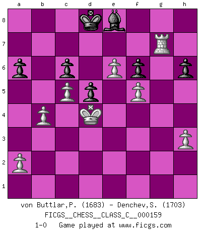 Last move : 1-0 2011 February 10 10:37:35 [Event "FICGS__CHESS__CLASS_C__000159"] [Site "FICGS"] [Date "2010.10.12"] [Round "1"] [White "von Buttlar,Paul"] [Black "Denchev,Stanimir"] [Result "1-0"] [WhiteElo "1683"] [BlackElo "1703"] 1.c4 e5 2.Nc3 Nc6 3.Nf3 Nf6 4.d4 e4 5.Nd2 Nxd4 6.Ndxe4 Nxe4 7.Nxe4 Bb4+ 8.Bd2 Bxd2+ 9.Qxd2 Nc6 10.g3 d6 11.Bg2 O-O 12.O-O Be6 13.b3 h6 14.Rad1 Qc8 15.Rfe1 Bh3 16.Bh1 Qe6 17.Nc3 Rae8 18.Nd5 Qd7 19.c5 Re6 20.Nf4 Rf6 21.Bxc6 bxc6 22.f3 Bf5 23.e4 Bh7 24.e5 Rxf4 25.Qxf4 d5 26.Qa4 Ra8 27.Qa6 Bf5 28.Qb7 Qe8 29.Qxc7 Qc8 30.Qxc8+ Rxc8 31.g4 Be6 32.h3 Rb8 33.Rd4 Kf8 34.Ra4 Rb7 35.f4 g6 36.Kf2 Ke7 37.Ke3 Kd7 38.Kd4 Kc7 39.Rf1 Kb8 40.f5 gxf5 41.gxf5 Bd7 42.Kc3 Rb5 43.b4 Rb7 44.Ra3 Be8 45.Rb3 Re7 46.Kd4 Kc7 47.Rg3 f6 48.e6 Kd8 49.Rg8 Rh7 50.Rfg1 a6 51.R1g7 Rxg7 52.Rxg7 1-0 English : Bradley Beach variation Kingside Castling by player Black (move 11) Kingside Castling by player White (move 12) Player White won this chess game. Follow this game move after move (download)It's always better to sacrifice your opponent's men. (Savielly Tartakover) Der Freibauer hat für mich eine Seele, genau wie der Mensch, Wünsche, die unerkannt in ihm schlummern, und Befürchtungen, von deren Existenz er selbst kaum ahnt. (Aaron Nimzowitsch) El jugador táctico debe saber que hacer cuando algo se debe de hacer. El estratégico debe saber que hacer cuando nada se debe de hacer. (Savielly Tartakover) Je ne crois pas en la psychologie, je crois aux bons coups. (Robert Fischer) Locking firmely the window serves nothing, only small thiefs pass through there, the big thiefs enter through the front door. (Luc-Olivier Leclerc)