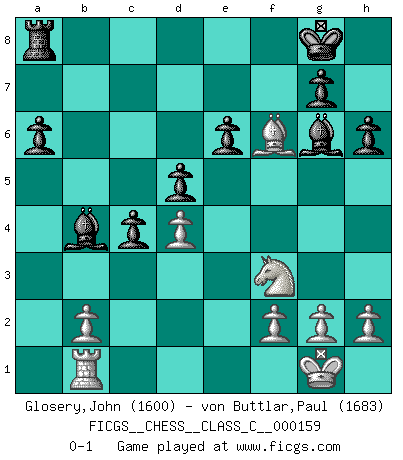Last move : 0-1 2010 October 25 20:21:22 [Event "FICGS__CHESS__CLASS_C__000159"] [Site "FICGS"] [Date "2010.10.12"] [Round "1"] [White "Glosery,John"] [Black "von Buttlar,Paul"] [Result "0-1"] [WhiteElo "1600"] [BlackElo "1683"] 1.e4 e6 2.Nf3 d5 3.e5 c5 4.c3 Nc6 5.d4 Qb6 6.Qb3 c4 7.Qxb6 axb6 8.Be2 f6 9.Bf4 fxe5 10.Nxe5 Nf6 11.O-O Nxe5 12.Bxe5 b5 13.Nd2 b4 14.Rfb1 Be7 15.Nf3 O-O 16.cxb4 Bxb4 17.Bd1 Bd7 18.Bc2 Ra6 19.Ng5 h6 20.Nf3 Rfa8 21.a4 Bxa4 22.Bg6 Be8 23.Rxa6 bxa6 24.Bxf6 Bxg6 0-1 French defense Kingside Castling by player White (move 11) Kingside Castling by player Black (move 15) Player Black won this chess game. Follow this game move after move (download)Becoming successful at Chess allows you to discover your own personality. That's what I want for the kids I teach. (Saudin Robovic) Matt entspricht nicht immer den Tatsachen. (Savielly Grigorievitsch Tartakower) Una victoria por una combinación errónea, aunque sea espectacular, me llena de horror artístico. (Wilhelm Steinitz) Botvinnik disait en comparant les échecs à la musique: Il existe une science dont le but est l'étude de l'acoustique et des sons. Mais il y a aussi un art qui se sert de l'océan des sons : c'est la musique. De toute évidence, il en est de même pour la pensée. La logique est l'étude des lois de la réflexion et les échecs reflètent, en tant qu'art, le côté logique de la réflexion, sous la forme d'images artistiques... Extrait de Fischer - Spassky, Reykjavik 1972 par Alexander & F. Wyndham (Ed. Solar), p 37. Sometimes it pays to stay in bed in Monday, rather than spending the rest of the week debugging Monday's code. (Dan Salomon)