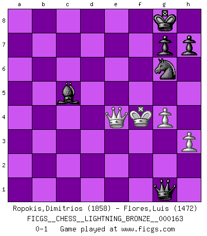 Last move : 0-1 2010 October 12 23:3:45 [Event "FICGS__CHESS__LIGHTNING_BRONZE__000163"] [Site "FICGS"] [Date "2010.10.12"] [Round "1"] [White "Ropokis,Dimitrios"] [Black "Flores,Luis"] [Result "0-1"] [WhiteElo "1858"] [BlackElo "1472"] 1.e4 c5 2.Nc3 Nc6 3.f4 e6 4.Nf3 Nf6 5.Bb5 Be7 6.h3 Nh5 7.O-O Nxf4 8.d4 cxd4 9.Nxd4 Ng6 10.Be3 O-O 11.Qd2 a6 12.Be2 b5 13.a4 Nxd4 14.Qxd4 b4 15.Na2 Qa5 16.c3 bxc3 17.bxc3 Bb7 18.Nb4 Rac8 19.Kh1 Rc7 20.Rac1 Rfc8 21.Bd2 f5 22.Nxa6 Bxa6 23.Bxa6 Qxa6 24.exf5 Nh4 25.fxe6 dxe6 26.Qe5 Rc5 27.Qe4 Nf5 28.Rf3 Rc4 29.Qb1 Rxa4 30.Rcf1 Rf8 31.c4 Qxc4 32.Be1 Ra3 33.R1f2 Rxf3 34.Rxf3 Bd6 35.Qd1 e5 36.g4 Nd4 37.Rxf8+ Bxf8 38.Kg1 Qd5 39.Qb1 Nf3+ 40.Kf2 e4 41.Bc3 Qc5+ 42.Kg2 Nh4+ 43.Kf1 Qc4+ 44.Kf2 Qxc3 45.Qxe4 Qd2+ 46.Kf1 Qd1+ 47.Kf2 Bc5+ 48.Kg3 Qg1+ 49.Kf4 Ng6+ 0-1 Sicilian : Grand Prix attack Kingside Castling by player White (move 7) Kingside Castling by player Black (move 10) 10 pieces endgame at move 45 : White KQPP , Black KQBNPP WHITE : King + 1 Queen 2 Pawns BLACK : King + 1 Queen 1 Bishop 1 Knight 2 Pawns Player Black won this chess game. Follow this game move after move (download)Live, lose, and learn, by observing your opponent how to win. (Amber Steenbock) Die meiste Zeit treffe ich auf Gegner, die meine Enkel sein könnten. Ich bin da, um ihnen zu zeigen, dass sie von mir noch einiges lernen können. (Viktor Kortschnoi) Cuando tu no sabes absolutamente que mas hacer, es tiempo de entrar en pánico. (John van der Wiel) Il vaut mieux sacrifier les pièces de l'adversaire. (Xavier Tartacover) Depression is just anger without enthusiasm. (Unknown)