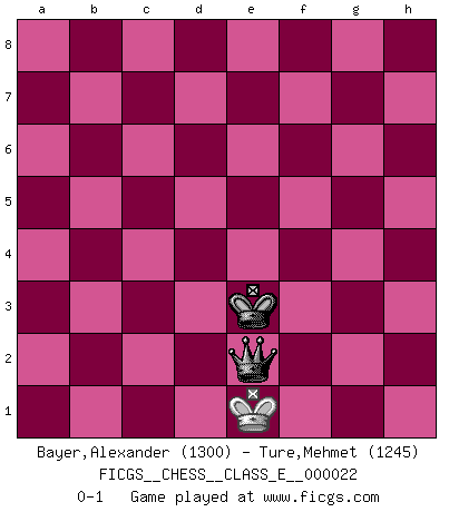Last move : 0-1 2007 October 5 20:21:59 [Event "FICGS__CHESS__CLASS_E__000022"] [Site "FICGS"] [Date "2006.11.25"] [Round "1"] [White "Bayer,Alexander"] [Black "Ture,Mehmet"] [Result "0-1"] [WhiteElo "1300"] [BlackElo "1245"] 1.d4 d5 2.Nf3 e6 3.Bf4 Nf6 4.e3 c5 5.Nc3 Nc6 6.Nb5 Kd7 7.Ng5 Qa5+ 8.c3 a6 9.Nc7 Ra7 10.Nxf7 Rg8 11.Bd3 cxd4 12.b4 Bxb4 13.cxb4 Qxb4+ 14.Kf1 dxe3 15.Nxe6 Kxe6 16.Ng5+ Kd7 17.Bxe3 d4 18.Bd2 Qb2 19.Bc4 Re8 20.Bf4 h6 21.Rb1 Qa3 22.Nf3 Re4 23.Bc1 Qa5 24.Bd3 Re6 25.Bb2 Rd6 26.Qc1 b6 27.Ba3 Re6 28.Qb2 Nd5 29.Qb3 Kd8 30.Bb2 Rae7 31.Rc1 Nf4 32.Ba3 Re8 33.Bc4 Nxg2 34.Rd1 Rf6 35.Nxd4 Re1+ 36.Kxg2 Rg6+ 37.Qg3 Bh3+ 38.Kxh3 Rxg3+ 39.Kxg3 Qg5+ 40.Kh3 Qh5+ 41.Kg3 Qxd1 42.Nxc6+ Kc7 43.Rxe1 Qxe1 44.Bb4 Qc1 45.Ne5 g5 46.Kg2 a5 47.Bf8 g4 48.Be7 b5 49.Bf7 Qc3 50.Bf6 h5 51.Kg1 Qe1+ 52.Kg2 Qe4+ 53.Kg3 Qf5 54.Bh8 h4+ 55.Kxh4 Qh7+ 56.Kxg4 Qxh8 57.Nf3 b4 58.h4 Qf6 59.Bb3 Qc6 60.Ng5 Qg2+ 61.Kh5 Qxf2 62.Be6 a4 63.Bd5 b3 64.axb3 a3 65.b4 Qe2+ 66.Kh6 Qg4 67.Kg6 Qxh4 68.Kf5 Qxb4 69.Ne4 Qb2 70.Kf4 a2 71.Bxa2 Qxa2 72.Kf5 Kd7 73.Nf6+ Ke7 74.Ne4 Qb2 75.Ng5 Qf6+ 76.Kg4 Qf8 77.Kg3 Kd6 78.Kg4 Kd5 79.Kg3 Qf5 80.Nh3 Ke5 81.Nf2 Qf4+ 82.Kg2 Kd4 83.Nh3 Qg4+ 84.Kf2 Qxh3 85.Kg1 Ke4 86.Kf2 Qh2+ 87.Kf1 Ke3 88.Ke1 Qe2+ 0-1 Queen's pawn game 10 pieces endgame at move 56 : White KBNPPP , Black KQPP WHITE : King + 1 Bishop 1 Knight 3 Pawns BLACK : King + 1 Queen 2 Pawns 9 pieces endgame at move 61 : White KBNPP , Black KQPP WHITE : King + 1 Bishop 1 Knight 2 Pawns BLACK : King + 1 Queen 2 Pawns 8 pieces endgame at move 64 : White KBNPP , Black KQP WHITE : King + 1 Bishop 1 Knight 2 Pawns BLACK : King + 1 Queen 1 Pawn 7 pieces endgame at move 67 : White KBNP , Black KQP WHITE : King + 1 Bishop 1 Knight 1 Pawn BLACK : King + 1 Queen 1 Pawn 6 pieces endgame at move 68 : White KBN , Black KQP WHITE : King + 1 Bishop 1 Knight BLACK : King + 1 Queen 1 Pawn 5 pieces endgame at move 71 : White KBN , Black KQ WHITE : King + 1 Bishop 1 Knight BLACK : King + 1 Queen 4 pieces endgame at move 71 : White KN , Black KQ WHITE : King + 1 Knight BLACK : King + 1 Queen 3 pieces endgame at move 84 : White K , Black KQ WHITE : King + BLACK : King + 1 Queen Player Black won this chess game. Follow this game move after move (download)What is the object of playing a gambit opening?... To acquire a reputation of being a dashing player at the cost of losing a game. (Siegbert Tarrasch) Die Arbeit ist etwas Unnatürliches. Die Faulheit allein ist göttlich. (Anatole France) Los Peones son nacidos libres, y aún así, se encuentran por doquier encadenados. (Rick Kennedy) Dieu déplace le joueur, et celui-ci la pièce. Quel Dieu derrière Dieu commence donc la trame ? Arturo Perez-Reverte (prix de littérature policière 1993). Do you know these so called Volunteers don't even get paid! (Simpsons)