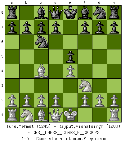 Last move : 1-0 2007 January 6 4:19:32 [Event "FICGS__CHESS__CLASS_E__000022"] [Site "FICGS"] [Date "2006.11.25"] [Round "1"] [White "Ture,Mehmet"] [Black "Rajput,Vishalsingh"] [Result "1-0"] [WhiteElo "1245"] [BlackElo "1200"] 1.e4 e5 2.Nf3 Nc6 3.Bc4 1-0 This chess game has been lost on time (started : 2006.11.25 23:4:51) King's pawn game Player White won this chess game. Follow this game move after move (download)Chess problems demand from the composer the same virtues that characterize all worthwhile art: originality, invention, conciseness, harmony, complexity, and splendid insincerity. (Vladimir Nabokov) Zum Sieg gelangt man nicht, wenn man gut, sondern nur wenn man besser spielt (Savielly Grigorievitsch Tartakower) El Ajedrez, como cualquier otra actividad creativa, puede existir solo a través de méritos combinados de aquellos que tienen talento creativo y de aquellos que tienen la habilidad de organizar un trabajo creativo. (Mikhail Botvinnik) Le thème de l'attaque double intervient d'une manière ou d'une autre dans l'immense majorité des combinaisons. (Youri Averbakh) When it is a question of money, everybody is of the same religion. (Voltaire)