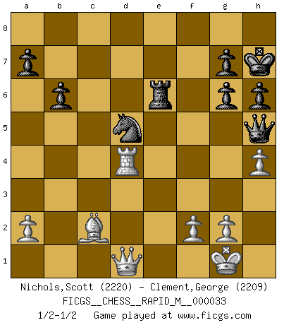 Last move : 1/2-1/2 2010 November 17 17:52:35 [Event "FICGS__CHESS__RAPID_M__000033"] [Site "FICGS"] [Date "2010.10.15"] [Round "1"] [White "Nichols,Scott"] [Black "Clement,George"] [Result "1/2-1/2"] [WhiteElo "2220"] [BlackElo "2209"] 1.e4 e5 2.Nf3 Nc6 3.d4 exd4 4.c3 dxc3 5.Nxc3 Nf6 6.Bc4 Bd6 7.Bg5 h6 8.Bh4 O-O 9.O-O Be7 10.e5 Ng4 11.Bxe7 Qxe7 12.Nd5 Qd8 13.Re1 d6 14.exd6 cxd6 15.Nc3 Qb6 16.Qe2 Bd7 17.Nd5 Qa5 18.b4 Nxb4 19.Qd2 Nc6 20.Ne7+ Kh8 21.Qxd6 Rad8 22.Bb3 Be6 23.Ng6+ fxg6 24.Qxe6 Nf6 25.Qc4 Rfe8 26.Rxe8+ Rxe8 27.h3 Kh7 28.Rd1 Ne5 29.Nxe5 Qxe5 30.Qc2 Qf5 31.Qd2 Qc5 32.Rc1 Qe5 33.Qc2 Re7 34.Qb1 Qg5 35.Rd1 b6 36.Bc2 Nd5 37.h4 Qh5 38.Rd4 Re6 39.Qd1 1/2-1/2 Scotch : Goering gambit Kingside Castling by player Black (move 8) Kingside Castling by player White (move 9) This chess game ended in a draw. Follow this game move after move (download)With or without the title, Bobby Fischer was unquestionably the greatest player of his time. (Burt Hochberg) Man braucht nicht immer den besten Zug zu spielen: Ein Zug muß aktiv, unternehmungslustig, korrekt und schön sein. (David Bronstein) No todos los artistas son jugadores de Ajedrez, pero todos los jugadores de Ajedrez son artistas. (Marcel Duchamp) J'ai toujours senti une vague pitié pour l'homme qui ne connaît rien aux échecs, tout comme j'en aurais pour un homme ignorant de l'amour. Les Echecs, comme la musique ou comme l'amour, ont le pouvoir de rendre heureux. (Siegbert Tarrasch) Live, lose, and learn, by observing your opponent how to win. (Amber Steenbock)
