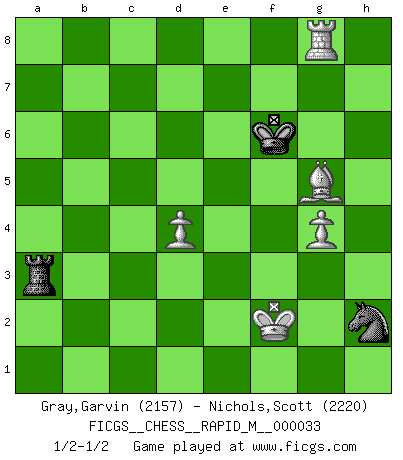 Last move : 1/2-1/2 2010 December 31 2:10:34 [Event "FICGS__CHESS__RAPID_M__000033"] [Site "FICGS"] [Date "2010.10.15"] [Round "1"] [White "Gray,Garvin"] [Black "Nichols,Scott"] [Result "1/2-1/2"] [WhiteElo "2157"] [BlackElo "2220"] 1.e4 d5 2.exd5 Qxd5 3.Nf3 Bg4 4.Be2 Nc6 5.h3 Bxf3 6.Bxf3 Qe6+ 7.Qe2 Qxe2+ 8.Bxe2 Nf6 9.d3 h5 10.O-O Nd4 11.Bd1 g6 12.Na3 Nf5 13.Nc4 Bg7 14.Re1 Nd5 15.c3 O-O-O 16.Bb3 e6 17.Ne5 Bxe5 18.Rxe5 c6 19.Bd2 Nb6 20.d4 h4 21.a4 Nd6 22.Bg5 Rde8 23.a5 Nd5 24.R5e1 Nf5 25.Bc2 Kd7 26.Rad1 Rh5 27.Bd2 Nc7 28.Bd3 Rd8 29.Kh2 Ke7 30.b3 a6 31.Bf1 R5h8 32.g4 hxg3+ 33.fxg3 f6 34.Bd3 c5 35.g4 Nh4 36.Be4 cxd4 37.cxd4 Nd5 38.Rc1 g5 39.Rc5 Kf7 40.Rf1 Kg7 41.b4 Rd7 42.b5 Rhd8 43.Re1 Rd6 44.Rec1 R8d7 45.Be1 axb5 46.Rxb5 Rf7 47.Kg1 Ng6 48.Rcb1 R6d7 49.Bxd5 exd5 50.Bg3 Rfe7 51.Kg2 Nf8 52.Rb6 Ne6 53.Bd6 Rf7 54.Re1 Nd8 55.Bg3 Nc6 56.a6 Na7 57.h4 Nc8 58.axb7 Rxb7 59.Rxb7 Rxb7 60.hxg5 Rb2+ 61.Kh3 fxg5 62.Re5 Kg6 63.Rxd5 Rb3 64.Kg2 Rb2+ 65.Bf2 Nb6 66.Rd8 Nc4 67.Rg8+ Kf6 68.Re8 Ra2 69.Rc8 Ne3+ 70.Kf3 Nf1 71.Rf8+ Kg6 72.Be3 Ra3 73.Re8 Nh2+ 74.Kg3 Nf1+ 75.Kf2 Nh2 76.Rg8+ Kf6 77.Bxg5+ 1/2-1/2 Scandinavian (centre counter) defense Kingside Castling by player White (move 10) Queenside Castling by player Black (move 15) 10 pieces endgame at move 61 : White KRBPP , Black KRNPP WHITE : King + 1 Rook 1 Bishop 2 Pawns BLACK : King + 1 Rook 1 Knight 2 Pawns 9 pieces endgame at move 63 : White KRBPP , Black KRNP WHITE : King + 1 Rook 1 Bishop 2 Pawns BLACK : King + 1 Rook 1 Knight 1 Pawn 8 pieces endgame at move 77 : White KRBPP , Black KRN WHITE : King + 1 Rook 1 Bishop 2 Pawns BLACK : King + 1 Rook 1 Knight This chess game ended in a draw. Follow this game move after move (download)The sign of a great Master is his ability to win a won game quickly and painlessly. (Irving Chernev) Ein Schachgenie ist jemand der verdammt gut Schach spielt. (Jonathan Levitt) Ayuda a tus piezas para que ellas te puedan ayudar. (Paul Morphy) Toute estimation doit être constamment réévaluée. (Jacob Estrin) The age of a woman doesn't mean a thing. The best tunes are played on the oldest fiddles. (Ralph Waldo Emerson)