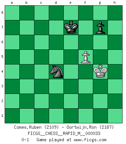 Last move : 0-1 2011 February 9 10:15:36 [Event "FICGS__CHESS__RAPID_M__000033"] [Site "FICGS"] [Date "2010.10.15"] [Round "1"] [White "Comes,Ruben"] [Black "Oortwijn,Ron"] [Result "0-1"] [WhiteElo "2109"] [BlackElo "2187"] 1.e4 c5 2.Nf3 d6 3.d4 cxd4 4.Nxd4 Nf6 5.Nc3 a6 6.h3 e6 7.g4 d5 8.Nde2 Bb4 9.Bg2 Nc6 10.exd5 Nxd5 11.O-O h5 12.Nxd5 exd5 13.gxh5 Rxh5 14.Nf4 Rh4 15.Qxd5 Qf6 16.Qd3 Bd6 17.Nd5 Qf5 18.Qxf5 Bxf5 19.Bg5 Rh8 20.Rad1 f6 21.Ne3 Bxh3 22.Rxd6 Bxg2 23.Kxg2 fxg5 24.Re1 Rd8 25.Nf5 Kf7 26.Rde6 Kg8 27.c4 Rh5 28.Rd6 Rxd6 29.Nxd6 Rh4 30.c5 Rb4 31.b3 a5 32.Re6 a4 33.bxa4 Rxa4 34.Nxb7 Rg4+ 35.Kf3 Rf4+ 36.Ke3 Nb4 37.Rd6 Kf8 38.c6 Rc4 39.Na5 Rc2 40.a3 Na6 41.Rd7 Rc5 42.Ra7 Rxa5 43.c7 Rxa3+ 44.Ke4 Nxc7 45.Rxa3 g4 46.Kf5 Nb5 47.Rb3 Nd4+ 48.Kxg4 Nxb3 49.f4 Nd4 50.f5 Ke7 0-1 This chess game has been lost on time (started : 2010.10.15 9:11:18) Thibault de Vassal What... happened... here... !? Flying pieces... Sicilian : Najdorf, Adams attack Kingside Castling by player White (move 11) 10 pieces endgame at move 42 : White KRPPP , Black KRNPP WHITE : King + 1 Rook 3 Pawns BLACK : King + 1 Rook 1 Knight 2 Pawns 9 pieces endgame at move 43 : White KRPP , Black KRNPP WHITE : King + 1 Rook 2 Pawns BLACK : King + 1 Rook 1 Knight 2 Pawns 8 pieces endgame at move 44 : White KRP , Black KRNPP WHITE : King + 1 Rook 1 Pawn BLACK : King + 1 Rook 1 Knight 2 Pawns 7 pieces endgame at move 45 : White KRP , Black KNPP WHITE : King + 1 Rook 1 Pawn BLACK : King + 1 Knight 2 Pawns 6 pieces endgame at move 48 : White KRP , Black KNP WHITE : King + 1 Rook 1 Pawn BLACK : King + 1 Knight 1 Pawn 5 pieces endgame at move 48 : White KP , Black KNP WHITE : King + 1 Pawn BLACK : King + 1 Knight 1 Pawn Player Black won this chess game. Follow this game move after move (download)Life is a kind of Chess, with struggle, competition, good and ill events. (Benjamin Franklin) Man gibt nur Pakete auf. (Paul Keres) Una buena ofensiva y una buena defensa, comienzan ambas con un buen desarrollo. (Bruce A. Moon) Les sacrifices démontrent seulement que quelqu'un a gaffé. (Savielly Tartacover) War is the child of passion, passion is the child of narcissism and narcissism is the child. (...) Another game ? (Thibault de Vassal)
