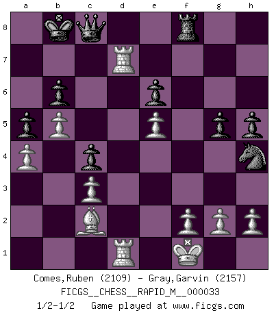 Last move : 1/2-1/2 2011 January 20 16:32:58 [Event "FICGS__CHESS__RAPID_M__000033"] [Site "FICGS"] [Date "2010.10.15"] [Round "1"] [White "Comes,Ruben"] [Black "Gray,Garvin"] [Result "1/2-1/2"] [WhiteElo "2109"] [BlackElo "2157"] 1.e4 e6 2.c3 d5 3.e5 c5 4.d4 Qb6 5.a3 Nc6 6.Nf3 Bd7 7.b4 c4 8.a4 f6 9.Be2 a6 10.O-O fxe5 11.Nxe5 Nxe5 12.dxe5 Qc7 13.Re1 a5 14.b5 Bc5 15.Bh5+ g6 16.Bg4 h5 17.Bf3 O-O-O 18.Na3 Nh6 19.Be3 Bxe3 20.Rxe3 Nf5 21.Re1 Kb8 22.Qc1 Rdf8 23.Bd1 Qd8 24.Qd2 g5 25.Bc2 Nh4 26.Qe3 Rf4 27.Re2 b6 28.Kf1 Rf7 29.Rd2 Rg8 30.Kg1 Rf4 31.Kf1 Rgf8 32.Re2 R4f7 33.Nxc4 dxc4 34.Rd1 Ka7 35.Red2 Rg7 36.Qd4 Qc8 37.Qxd7+ Rxd7 38.Rxd7+ Kb8 1/2-1/2 French defense Kingside Castling by player White (move 10) Queenside Castling by player Black (move 17) This chess game ended in a draw. Follow this game move after move (download)No Chess Grandmaster is normal; they only differ in the extent of their madness. (Viktor Korchnoi) Ein Gewinn durch eine ungenaue Kombination, sei sie auch noch so vorzeigbar, erfüllt mich mit Schaudern. (Wilhelm Steinitz) Observen a Garry Kasparov. Después de una derrota, invariablemente el gana la próxima partida. Prácticamente hace pedazos a su siguiente oponente. Eso es algo que tenemos que aprender a lograr. (Maurice Ashley) On croit qu'il y a plus de mauvais joueurs que de bons joueurs, c'est faux : Il y a autant de joueurs qui gagnent que de joueurs qui perdent. (Philippe Geluck) There is no instance of a country having benefited from prolonged warfare. (Sun Tzu)