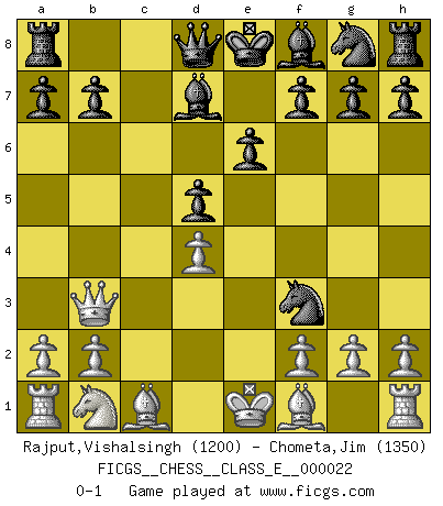 Last move : 0-1 2007 January 7 10:45:45 [Event "FICGS__CHESS__CLASS_E__000022"] [Site "FICGS"] [Date "2006.11.25"] [Round "1"] [White "Rajput,Vishalsingh"] [Black "Chometa,Jim"] [Result "0-1"] [WhiteElo "1200"] [BlackElo "1350"] 1.e4 e6 2.d4 d5 3.e5 c5 4.c3 cxd4 5.Qa4+ Nc6 6.cxd4 Bd7 7.Nf3 Nxe5 8.Qb3 Nxf3+ 0-1 This chess game has been lost on time (started : 2006.11.25 23:4:51) French : Advance variation Player Black won this chess game. Follow this game move after move (download)Chess is a more highly symbolic game, but the aggressions are therefore even more frankly represented in the play. It probably began as a war game; that is, the representation of a miniature battle between the forces of two kingdoms. (Karl Meninger) Frage: Gibt es etwas was Sie mehr lieben als Autobahnen ohne Tempobegrenzungen? - Antwort: Deutsche Frauen ohne Tempobegrenzungen. (Loek van Wely) Un entendimiento minucioso de las típicas continuaciones de mate hacen de las mas complicadas combinaciones de sacrificio que conducen hacia ellas no solo no dificiles, sino casi un asunto de rutina. (Siegbert Tarrasch) Les Echecs sont et restent toujours un combat, un combat intégral comme la boxe, la lutte ou un autre sport, et où il doit y avoir un vainqueur et un vaincu. (Joseph Emil Diemer) Pushing plastic is for the many, pushing virtual pieces is for the fewer, pushing wood is for the very few. (Normajean Yates)