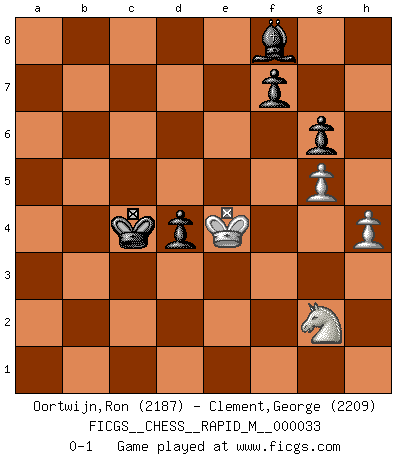 Last move : 0-1 2010 December 31 16:2:33 [Event "FICGS__CHESS__RAPID_M__000033"] [Site "FICGS"] [Date "2010.10.15"] [Round "1"] [White "Oortwijn,Ron"] [Black "Clement,George"] [Result "0-1"] [WhiteElo "2187"] [BlackElo "2209"] 1.e4 e5 2.Nf3 Nc6 3.Bb5 a6 4.Ba4 Nf6 5.O-O Be7 6.Re1 b5 7.Bb3 d6 8.c3 O-O 9.h3 Bb7 10.d4 Re8 11.Nbd2 Bf8 12.a4 h6 13.Bc2 exd4 14.cxd4 Nb4 15.Bb1 c5 16.d5 g6 17.Nf1 Bg7 18.axb5 axb5 19.Rxa8 Qxa8 20.Bf4 Qa6 21.Qc1 Kh7 22.Ng3 Qb6 23.Bd2 Ra8 24.b3 Nd7 25.Nh5 Bh8 26.Bxh6 Ne5 27.Ng5+ Kg8 28.Qf4 Qd8 29.Ng3 c4 30.bxc4 bxc4 31.Ne2 Qb6 32.Qh4 Nbd3 33.Rf1 Qb2 34.Nh7 Nd7 35.Ng3 Ra1 36.Bxd3 cxd3 37.Be3 d2 38.Bxd2 Qxd2 39.Qd8+ Kxh7 40.Rxa1 Bxa1 41.Qxd7 Qe1+ 42.Kh2 Qxf2 43.Qxb7 Qf4 44.Qb3 Be5 45.Qf3 Kg7 46.Qxf4 Bxf4 47.h4 Kf6 48.Kh3 Ke5 49.Ne2 Kxe4 50.Nc3+ Ke5 51.Kg4 Bd2 52.Nb1 Bc1 53.Nc3 Bb2 54.Ne2 Kxd5 55.Kf3 Bf6 56.Nf4+ Kc4 57.g3 d5 58.Ng2 d4 59.Ke4 Bg7 60.g4 Bh6 61.g5 Bf8 0-1 Ruy Lopez : Closed Kingside Castling by player White (move 5) Kingside Castling by player Black (move 8) 10 pieces endgame at move 49 : White KNPPP , Black KBPPP WHITE : King + 1 Knight 3 Pawns BLACK : King + 1 Bishop 3 Pawns 9 pieces endgame at move 54 : White KNPP , Black KBPPP WHITE : King + 1 Knight 2 Pawns BLACK : King + 1 Bishop 3 Pawns Player Black won this chess game. Follow this game move after move (download)Combinations have always been the most intriguing aspect of Chess. The masters look for them, the public applauds them, the critics praise them. It is because combinations are possible that Chess is more than a lifeless mathematical exercise. They are the poetry of the game; they are to Chess what melody is to music. They represent the triumph of mind over matter. (Reuben Fine) Gegen einen Schachcomputer zu verlieren ist wie Löcher in den Strümpfen zuhaben. Es ist nicht peinlich, solange man der einzige ist der es weiß. (Anonymous) Aquel que teme a un Peón de Reina aislado, debería de retirarse del Ajedrez. (Siegbert Tarrasch) Mais n'est-ce pas déjà le limiter injurieusement que d'appeler les échecs un jeu? N'est-ce pas aussi une science, un art, ou quelque chose qui, comme le cercueil de Mahomet entre ciel et terre, est suspendu entre l'un et l'autre, et qui réunit un nombre incroyable de contraires ? (Stefan Zweig) Treat your password like your toothbrush. Don't let anybody else use it, and get a new one every six months. (Clifford Stoll)