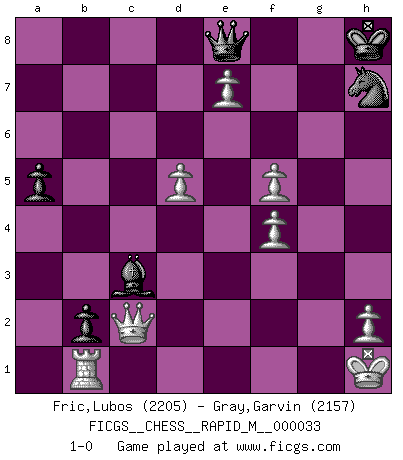 Last move : 1-0 2011 May 25 11:15:57 [Event "FICGS__CHESS__RAPID_M__000033"] [Site "FICGS"] [Date "2010.10.15"] [Round "1"] [White "Fric,Lubos"] [Black "Gray,Garvin"] [Result "1-0"] [WhiteElo "2205"] [BlackElo "2157"] 1.d4 d5 2.c4 e6 3.Nc3 Nf6 4.cxd5 exd5 5.Bg5 Be7 6.e3 O-O 7.Bd3 c6 8.Qc2 h6 9.Bh4 Re8 10.Nge2 Nbd7 11.f3 c5 12.O-O c4 13.Bf5 Nb6 14.Bxc8 Rxc8 15.a4 Na8 16.Rad1 Qd7 17.Bg3 Nc7 18.Bxc7 Qxc7 19.Ng3 Qc6 20.e4 a6 21.e5 Nd7 22.a5 Bb4 23.Nf5 Rcd8 24.f4 Nf8 25.Rf3 Kh8 26.Ne2 Qc7 27.Neg3 Nh7 28.Nxg7 Kxg7 29.Nf5+ Kh8 30.Nxh6 Rf8 31.Rh3 Bxa5 32.Nf5 f6 33.Nh4 Rde8 34.Ng6+ Kg8 35.Nxf8 Rxf8 36.Qe2 Bb4 37.e6 f5 38.Rf1 Nf6 39.Rg3+ Kh8 40.Rg6 Nh7 41.g4 Rg8 42.gxf5 Nf6 43.Rg5 Rg7 44.Rf3 Rh7 45.Rg6 Be7 46.Kh1 Qb6 47.Qf2 Qd8 48.Qg2 Qa5 49.Qg1 Qd8 50.Rfg3 Qf8 51.Qg2 b5 52.Rh3 Rxh3 53.Qxh3+ Nh7 54.Qh5 Qe8 55.Qf3 b4 56.Qxd5 Qf8 57.Qe5+ Bf6 58.Qe4 b3 59.d5 c3 60.bxc3 b2 61.Rg1 a5 62.Rb1 Bxc3 63.e7 Qe8 64.Qc2 1-0 QGD : Exchange, positional line Kingside Castling by player Black (move 6) Kingside Castling by player White (move 12) Player White won this chess game. Follow this game move after move (download)If your opponent cannot do anything active, then don't rush the position; instead you should let him sit there, suffer, and beg you for a draw. (Jeremy Silman) Er war ein guter Schachspieler, aber ich kann Leute nicht ausstehen, die 'Heil Hitler' rufen (Über Alexander Aljechin). (Miguel Najdorf) Haz el enroque temprano y seguido. (Rob Sillars) Pour se monter efficace, un Cavalier a besoin d'avant-postes ! Les Cavaliers font les meilleurs bloqueurs de pions passés. The project of the man are lower than those of the sky. (Chinese proverb)