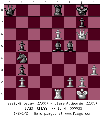 Last move : 1/2-1/2 2010 December 25 1:31:35 [Event "FICGS__CHESS__RAPID_M__000033"] [Site "FICGS"] [Date "2010.10.15"] [Round "1"] [White "Gazi,Miroslav"] [Black "Clement,George"] [Result "1/2-1/2"] [WhiteElo "2300"] [BlackElo "2209"] 1.e4 e5 2.Nf3 Nc6 3.Bb5 a6 4.Ba4 Nf6 5.O-O Be7 6.Re1 b5 7.Bb3 d6 8.c3 O-O 9.h3 Bb7 10.d4 Re8 11.a4 h6 12.Nbd2 exd4 13.cxd4 Nb4 14.axb5 axb5 15.Rxa8 Qxa8 16.e5 dxe5 17.dxe5 Nh5 18.e6 f5 19.Ne5 Nf6 20.Ndf3 c5 21.Nh4 c4 22.Bxh6 Be4 23.Bg5 cxb3 24.Bxf6 Bxf6 25.Qh5 Bxe5 26.Qf7+ Kh7 27.Qg6+ Kg8 28.Nxf5 Bxf5 1/2-1/2 Ruy Lopez : Closed Kingside Castling by player White (move 5) Kingside Castling by player Black (move 8) This chess game ended in a draw. Follow this game move after move (download)If cunning alone were needed to excel, women would be the best Chess players. (Albin) Am wohlsten fühle ich mich, wenn ich sehe, wie sich mein Gegner im Todeskampf windet. (Robert James Fischer) Jugadores de primera clase pierden en contra de jugadores de segunda clase porque los jugadores de segunda clase a veces juegan una partida de primer clase. (Siegbert Tarrasch) Les réformistes prétendent que les progrès de la théorie conduiront à la disparition des échecs, et qu'il faut, pour leur rendre vie, en remanier les règles. En réalité, qu'exprime cette affirmation? Le mépris de l'intuition, de l'imagination et de tous les autres éléments qui font des échecs un art. (Alexander Alekhine) There is a great deal of difference between an eager man who wants to read a book and a tired man who wants a book to read. (G.K. Chesterton)