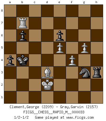 Last move : 1/2-1/2 2011 January 21 17:55:45 [Event "FICGS__CHESS__RAPID_M__000033"] [Site "FICGS"] [Date "2010.10.15"] [Round "1"] [White "Clement,George"] [Black "Gray,Garvin"] [Result "1/2-1/2"] [WhiteElo "2209"] [BlackElo "2157"] 1.e4 e6 2.d4 d5 3.Nc3 Bb4 4.e5 c5 5.a3 Bxc3+ 6.bxc3 Ne7 7.Qg4 Qc7 8.Qxg7 Rg8 9.Qxh7 cxd4 10.Ne2 dxc3 11.f4 Nbc6 12.h4 Bd7 13.h5 d4 14.h6 O-O-O 15.Qd3 Kb8 16.h7 Rh8 17.g4 Bc8 18.Rh3 b6 19.Rb1 Bb7 20.Kf2 Nd5 21.Bg2 Qc8 22.g5 Ba6 23.Qf3 Nde7 24.a4 d3 25.Ba3 dxc2 26.Rc1 Bxe2 27.Qxe2 Rd2 28.Bd6+ Kb7 29.Bxe7 Qd7 30.Bd6 Rxe2+ 31.Kxe2 Ka6 32.Rxc3 Nd4+ 33.Kd3 Nf5 34.Rc7 Qxa4 35.Bb7+ Ka5 36.Bb4+ Kxb4 37.Rc4+ Kb3 38.Rxa4 Kxa4 39.Rxc2 Rxh7 40.Be4 Rh3+ 41.Kd2 Ng3 42.Bd3 a5 43.Rc7 Kb4 44.Rxf7 a4 45.Rb7 1/2-1/2 French : Winawer, Advance, poisoned pawn variation Queenside Castling by player Black (move 14) This chess game ended in a draw. Follow this game move after move (download)The winner of the game is the player who makes the next-to-last mistake. (Savielly Tartakover) Schach verlangt totale Konzentration. (Robert James Fischer) Tu sabes que vas a perder. Aún cuando tenía la ventaja, yo sabía que iba a perder. - al estar jugando con Fischer (Andrew Soltis) Celui qui prend des risques peut perdre, celui qui n'en prend pas perd toujours. (Xavier Tartacover) Beta. Software undergoes beta testing shortly before it's released. Beta is latin for still doesn't work. (Anonymous)