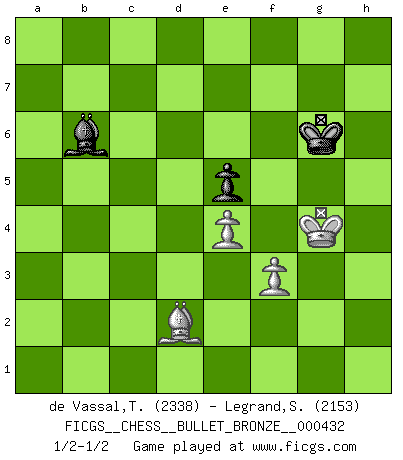 Last move : 1/2-1/2 2010 October 15 21:24:47 [Event "FICGS__CHESS__BULLET_BRONZE__000432"] [Site "FICGS"] [Date "2010.10.15"] [Round "1"] [White "de Vassal,Thibault"] [Black "Legrand,Stephane"] [Result "1/2-1/2"] [WhiteElo "2338"] [BlackElo "2153"] 1.e4 e5 2.Nf3 Nc6 3.Bb5 a6 4.Ba4 d6 5.c3 Bd7 6.d4 g6 7.O-O Bg7 8.Be3 Nf6 9.Nbd2 O-O 10.Re1 Re8 11.d5 Ne7 12.Bxd7 Qxd7 13.h3 c6 14.c4 Rac8 15.a4 h6 16.a5 g5 17.Ra4 Ng6 18.Rb4 Qc7 19.Qb3 Re7 20.Rb6 c5 21.Nh2 Nf4 22.Ng4 Nd7 23.Rxb7 Qxa5 24.Nf3 Qd8 25.Bd2 Nf6 26.Ba5 Rxb7 27.Nxf6+ Bxf6 28.Qxb7 Qe8 29.Ra1 Rb8 30.Qxa6 Qd7 31.b4 g4 32.Qc6 Qxc6 33.dxc6 cxb4 34.hxg4 Rc8 35.c7 b3 36.Nd2 Ne6 37.Nxb3 Kg7 38.Rd1 Be7 39.f3 Nxc7 40.c5 Ne8 41.cxd6 Nxd6 42.Bb4 Rb8 43.Bc3 f6 44.Na5 Bf8 45.Kf1 Rc8 46.Bd2 Nb5 47.Rb1 Nd4 48.Rb7+ Kg6 49.Nb3 Nxb3 50.Rxb3 h5 51.gxh5+ Kxh5 52.Rc3 Rb8 53.Rc6 Be7 54.g4+ Kg6 55.Bc1 Rb5 56.Kf2 Bc5+ 57.Kg3 Be7 58.g5 Rc5 59.Rxc5 Bxc5 60.Kg4 fxg5 61.Bxg5 Bb6 62.Bd2 1/2-1/2 Ruy Lopez : Modern Steinitz defense, Fianchetto (Bronstein) variation Kingside Castling by player White (move 7) Kingside Castling by player Black (move 9) 10 pieces endgame at move 59 : White KRBPPP , Black KBPP WHITE : King + 1 Rook 1 Bishop 3 Pawns BLACK : King + 1 Bishop 2 Pawns 9 pieces endgame at move 59 : White KBPPP , Black KBPP WHITE : King + 1 Bishop 3 Pawns BLACK : King + 1 Bishop 2 Pawns 8 pieces endgame at move 60 : White KBPP , Black KBPP WHITE : King + 1 Bishop 2 Pawns BLACK : King + 1 Bishop 2 Pawns 7 pieces endgame at move 61 : White KBPP , Black KBP WHITE : King + 1 Bishop 2 Pawns BLACK : King + 1 Bishop 1 Pawn This chess game ended in a draw. Follow this game move after move (download)I like to say that Bobby Fischer was the greatest player ever. But what made Fischer a genius was his ability to blend an American freshness and pragmatism with Russian ideas about strategy. (Bruce Pandolfini) Kasparov ist eine Art Monster mit hundert Augen, denen auch nicht das Geringste entgeht. (Tony Miles) El poder defensivo de una pieza clavada, solamente es imaginario. (Aaron Nimzovich) Le système Elo représente seulement une moyenne. Il est simplement un indicateur de votre stabilité. (Anatoli Karpov) The weakness of an artist is dogma. (Josh Waitzkin)