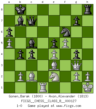 Last move : 1-0 2011 March 17 0:20:52 [Event "FICGS__CHESS__CLASS_B__000127"] [Site "FICGS"] [Date "2010.10.16"] [Round "1"] [White "Gonen,Barak"] [Black "Axon,Alexander"] [Result "1-0"] [WhiteElo "1800"] [BlackElo "1813"] 1.d4 d5 2.c4 c6 3.Nf3 Nf6 4.Nc3 e6 5.e3 Nbd7 6.Bd3 dxc4 7.Bxc4 b5 8.Bd3 Bb7 9.O-O a6 10.e4 c5 11.d5 Qc7 12.dxe6 fxe6 13.Bc2 Bd6 14.Ng5 Nf8 15.f4 O-O-O 16.Qf3 h6 17.Nh3 c4 18.Be3 Kb8 19.Ne2 e5 20.a4 b4 21.f5 N8d7 22.Nf2 Bc5 23.Kh1 h5 24.a5 Ng4 25.Nxg4 hxg4 26.Qg3 Nf6 27.Rad1 Rxd1 28.Rxd1 1-0 QGD Slav : 4.Nc3 Kingside Castling by player White (move 9) Queenside Castling by player Black (move 15) Player White won this chess game. Follow this game move after move (download)A sacrifice is best refuted by accepting it. (Wilhelm Steinitz) Modernes Schach sorgt sich zuviel um Dinge wie Bauernstruktur usw. Vergessen Sie das, Schachmatt beendet das Spiel! (Nigel Short) Los errores estan ahí, esperando a que se cometan. (Savielly Tartakower) Ce qui est bien, c'est d'avoir tout un tas de pièces en prise : l'adversaire ne peut en prendre qu'une à la fois. Cité par Thierry Audin. Hardware: the parts of a computer that can be kicked. (Jeff Persis)