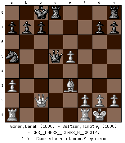 Last move : 1-0 2011 February 21 22:54:0 [Event "FICGS__CHESS__CLASS_B__000127"] [Site "FICGS"] [Date "2010.10.16"] [Round "1"] [White "Gonen,Barak"] [Black "Seltzer,Timothy"] [Result "1-0"] [WhiteElo "1800"] [BlackElo "1800"] 1.d4 d5 2.c4 dxc4 3.e4 e5 4.Nf3 exd4 5.Bxc4 Bb4+ 6.Nbd2 Nc6 7.a3 Bxd2+ 8.Qxd2 Bg4 9.Qf4 Be6 10.Bxe6 fxe6 11.b4 Nf6 12.b5 Na5 13.e5 Nd5 14.Qg4 Qd7 15.Nxd4 O-O-O 16.O-O Nc3 17.Be3 Nxb5 18.Nxb5 Qxb5 19.Qxe6+ Qd7 20.Qa2 Qd5 21.Qc2 1-0 QGA : 3.e4 Queenside Castling by player Black (move 15) Kingside Castling by player White (move 16) Player White won this chess game. Follow this game move after move (download)You need not play well - just help your opponent to play badly. (Genrikh Chepukaitis) Ich hatte meine größten Erfolge, als ich 47 Jahre alt war. Kasparow war noch nicht mal 42 und hat das Schach schon im Stich gelassen. (Viktor Kortschnoi) Por esta medida (el intervalo entre Fischer y sus contemporaneos), yo le considero el mas grande campeón mundial. (Garry Kasparov) Les Echecs, c'est l'art de la guerre sans les charniers, c'est la résurrection des morts tombés au champ d'honneur, l'espoir perpétuel, la suprématie de l'intelligence sur la force, la culture de l'esprit. (F. Szpiner) It is the aim of the modern school, not to treat every position according to one general law, but according to the principle inherent in the position. (Richard Reti)